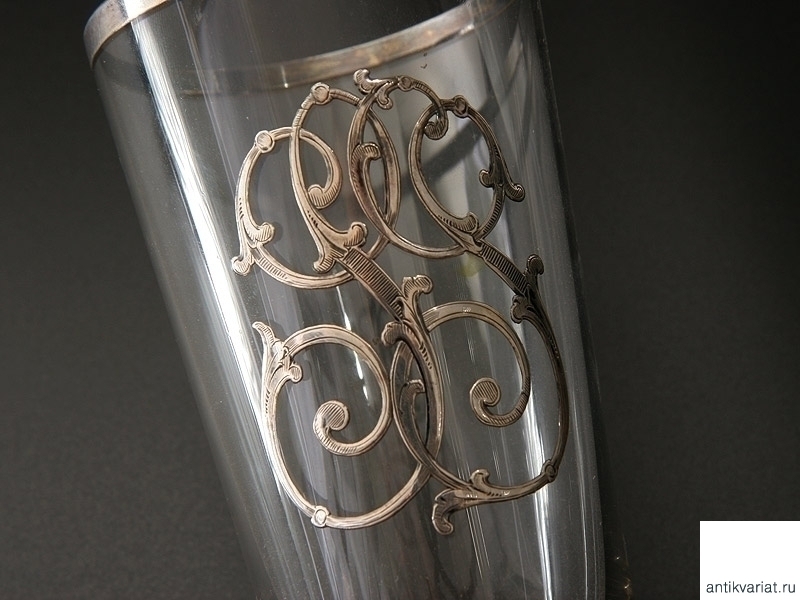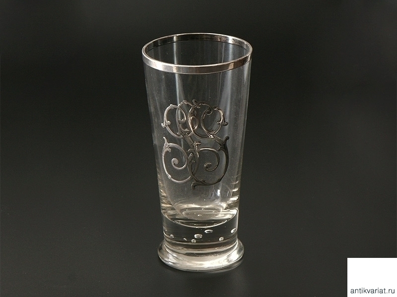Стеклянный тонкостенный бокал с серебряным ободком и впрессованным вензелем владельца "G.G.". Конец XIX века. Отличное состояние.