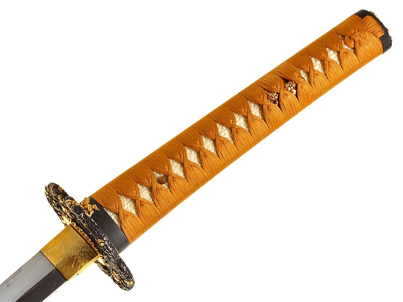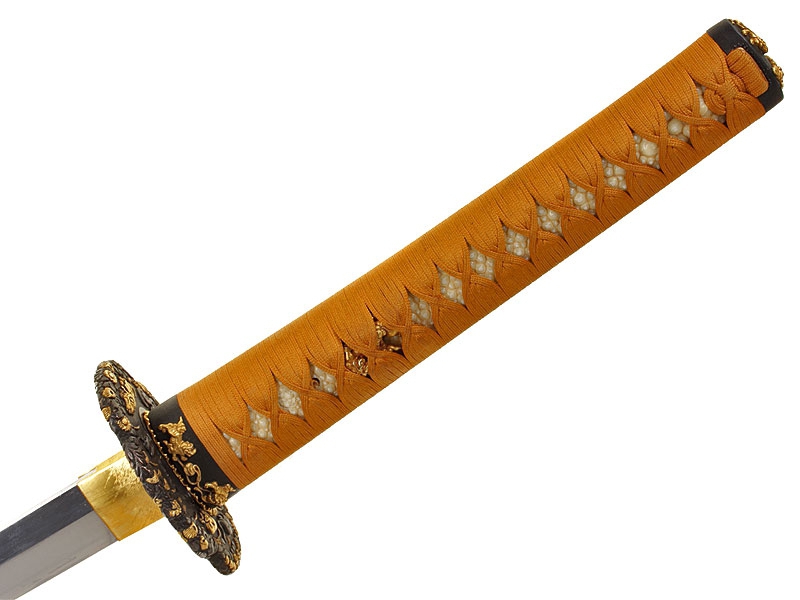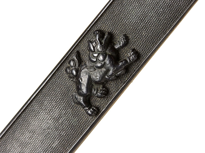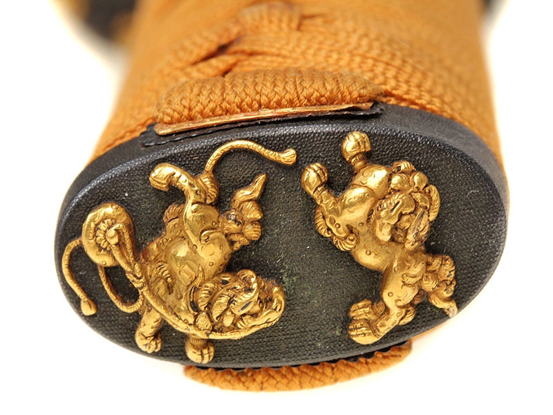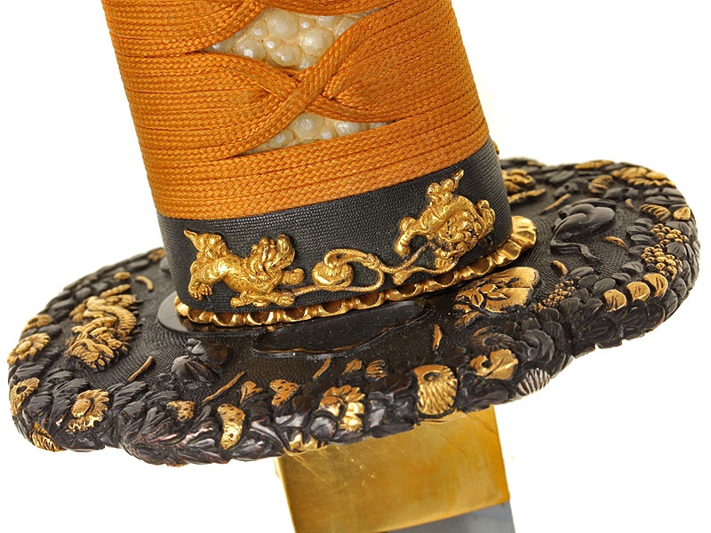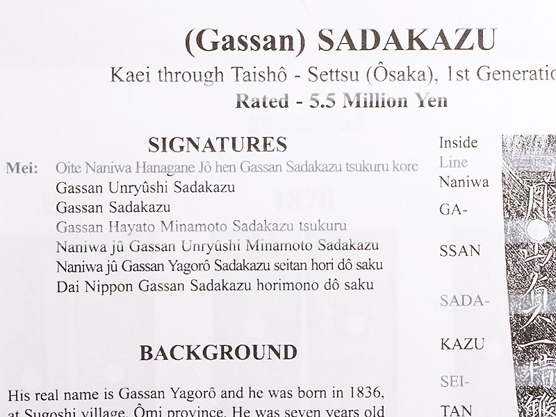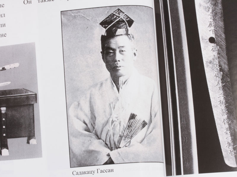 Большой самурайский меч катана работы выдающегося мастера Гассана Садакадзу - сына и преемника Гассана Садаёси, изготовленный в 1905 году в городе Осака. Клинок в превосходной полировке, с прямой линией закалки (хамон ва сугу-ба). Острие клинка имеет окружность с возвратом к обуху, что встречается редко. Хвостовик подписан мастером и имеет одно крепежное отверстие. Ниже подписи имеется печать - кокуин. Рукоять деревянная, обтянута кожей ската и оплетена тесьмой золотистого цвета. Цуба из сплава меди и золота, патинированная, формы мокко-гата, с рельефными изображениями двенадцати животных - символов лунного календаря, покрытыми позолотой. Фути и касира парные, с изображением львов, как и мэнуки. Деревянные основа рукояти и ножны также изготовлены в период Мэйдзи. Ножны покрыты блестящим черным лаком. В комплект входят сира-сайя для хранения клинка.