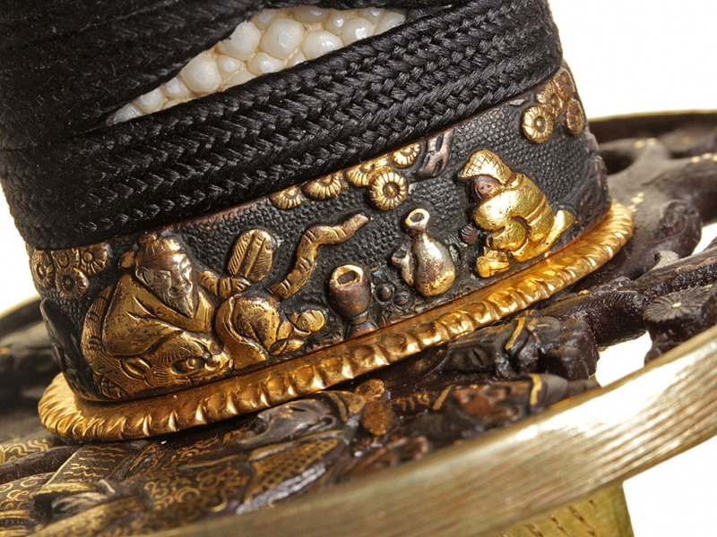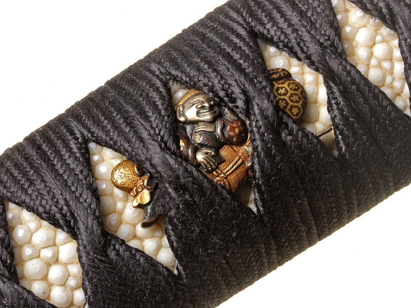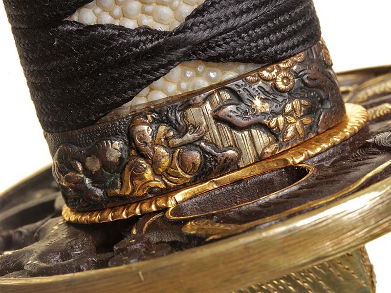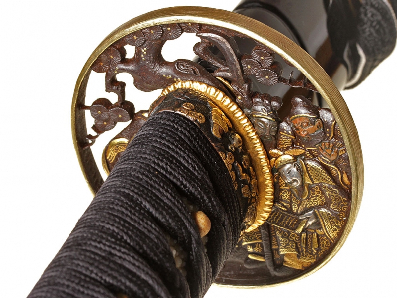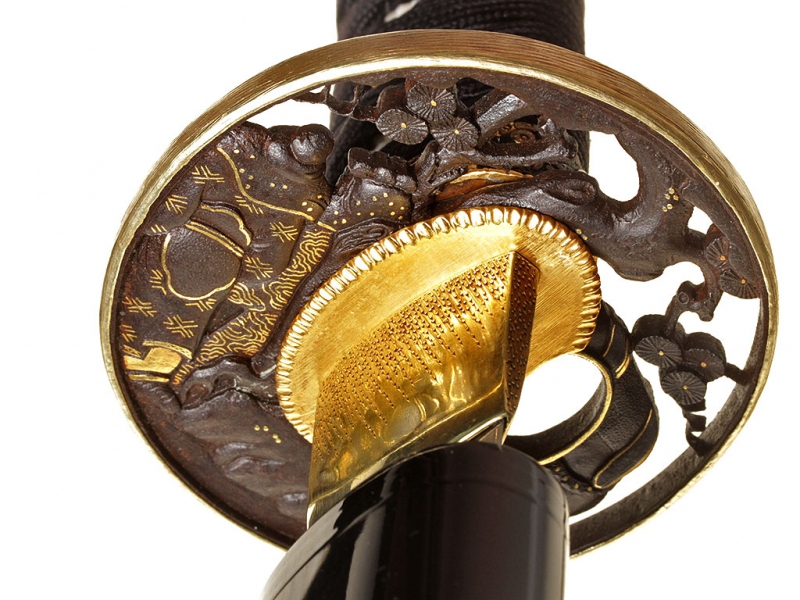 Большой самурайский меч катана работы мастера Канэнори из провинции Мино. Датируется 1565 годом. Клинок с красивой волнистой линией закалки, хвостовик подписан мастером, имеет два крепежных отверстия. Муфта хабаки позолочена. Рукоять деревянная, обтянутая кожей ската, оплетена тесьмой. Цуба стальная, украшена мифологической сценкой с золотой таушировкой и имеет отдельный сертификат NBTHK. Мэнуки выполнены в виде человеческих фигурок и украшены золочением и серебрением. В комплект входит сира-сайя для хранения клинка.