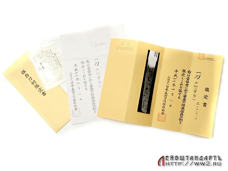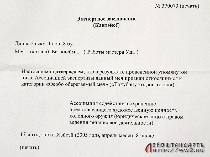 К мечу прилагается экспертное заключение, выданное Ассоциацией сохранения и изучения японского меча: в документе указано, что данный предмет относится к категории "Особо оберегаемый меч".