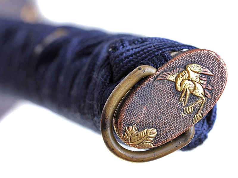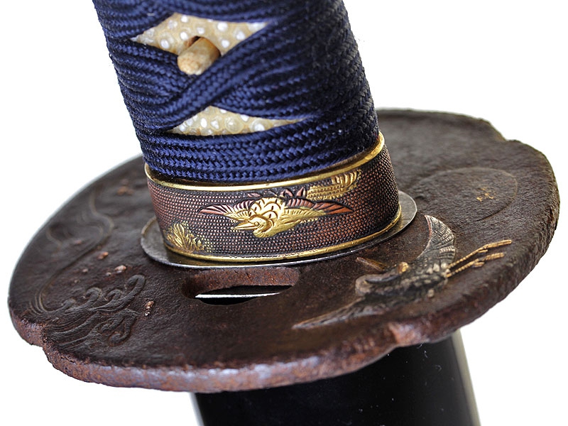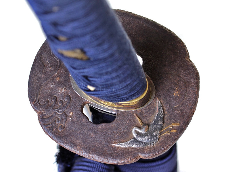 Большой самурайский меч катана работы мастера Суэцугу Шигэмицу и по времени изготовления относится к периоду "гэндай-то" (с 1877 года до наших дней). Сам клинок с чуть волнистой, местами почти прямой линией закалки. Хвостовик подписан мастером, имеет одно крепежное отверстие. Рукоять деревянная, обтянутая кожей ската, оплетена тесьмой. Цуба кованая стальная, украшена рельефным изображением журавля, таушированным золотом (журавль - символ долголетия). Элементы оправы рукояти изготовлены из патинированной бронзы с золочением и также украшены в аналогичном стиле. Ножны покрыты черным блестящим лаком.