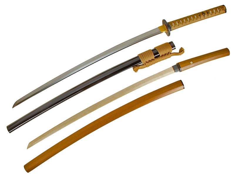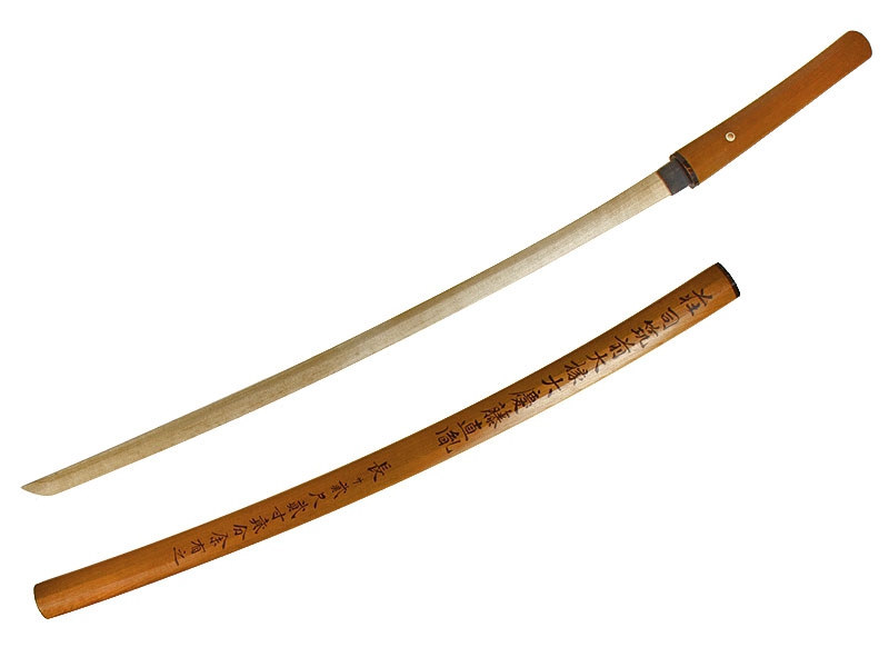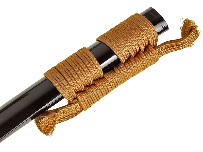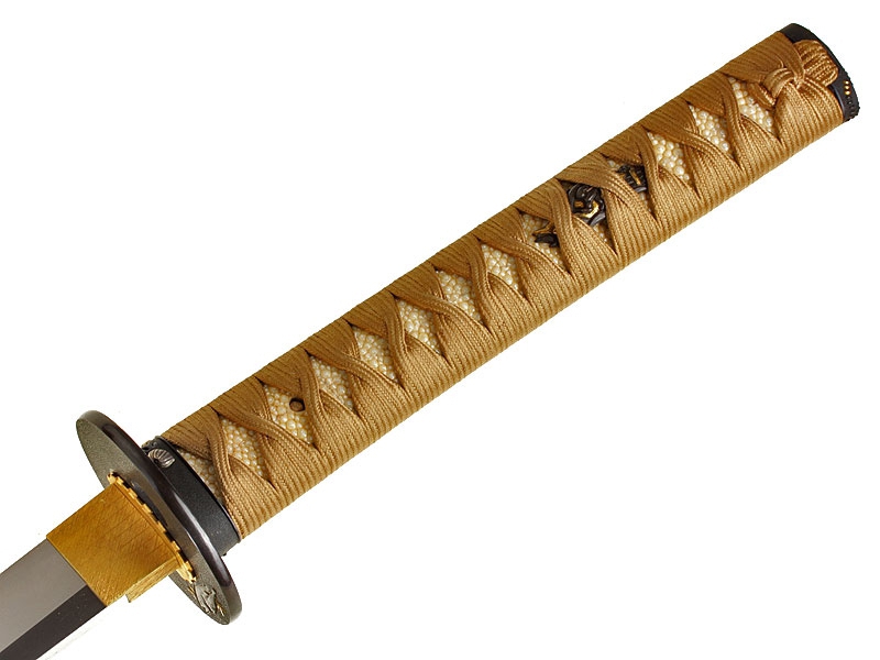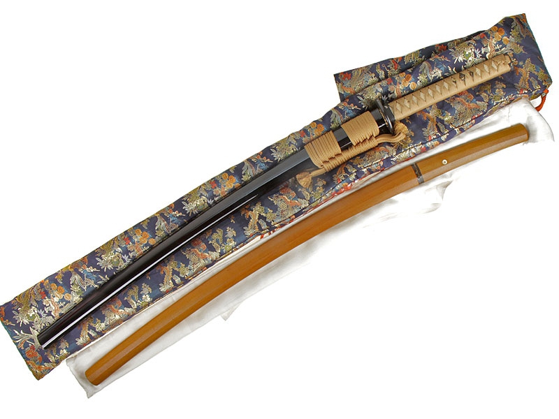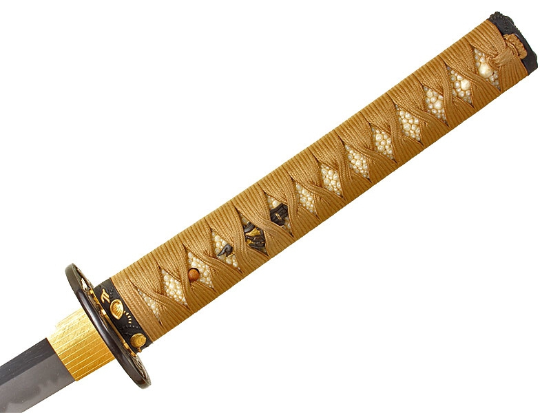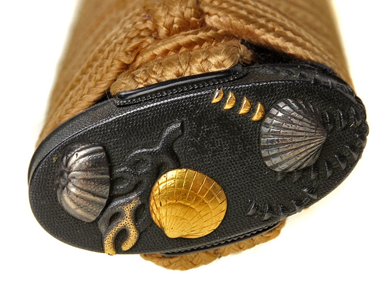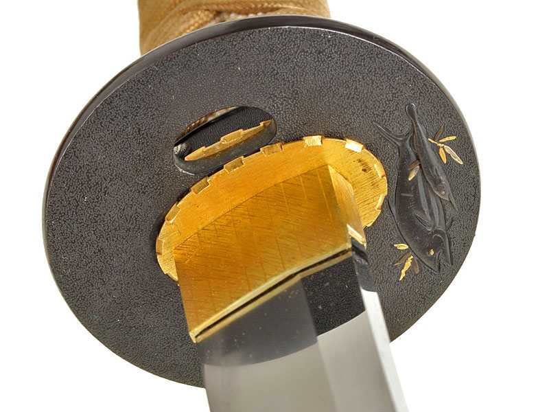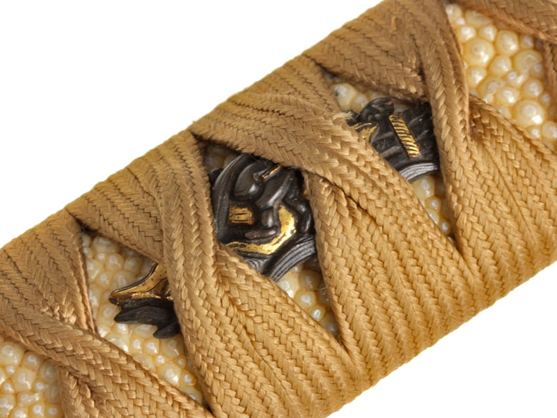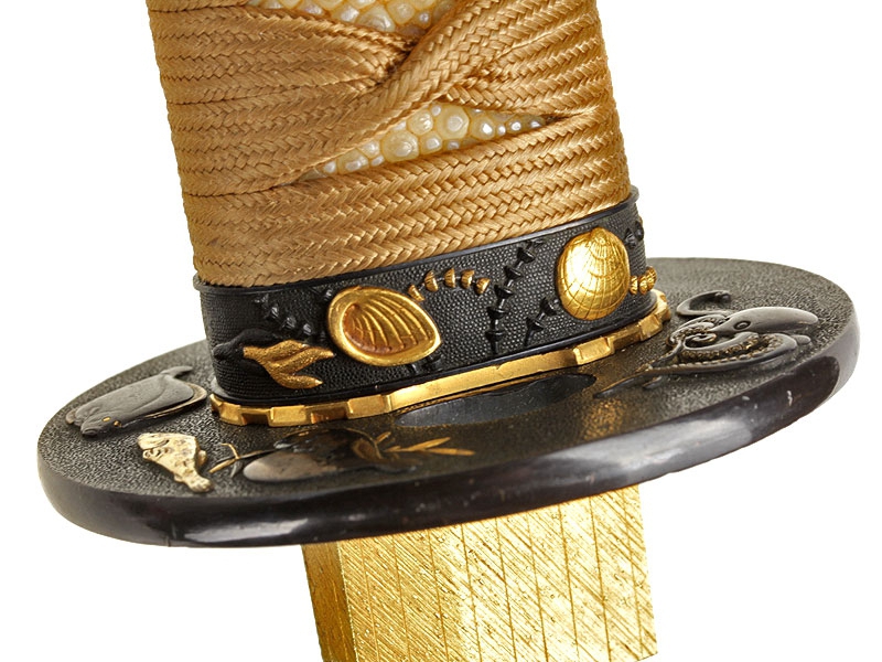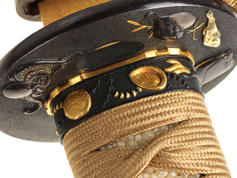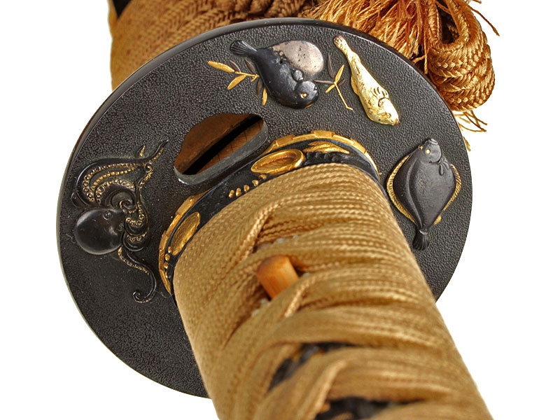 Большой самурайский меч катана работы мастера Сёдзи Тикудзэн-но Дайдзё Тайкэй Фудзи Наотанэ из провинции Мусаси (Эдо), с датировкой "Середина весны пятого года под девизом "Бунсэй", что соответствует 1822 году. Превосходный клинок в отличной полировке, с линией закалки красивых волнистых очертаний. Хвостовик подписан мастером и имеет одно крепежное отверстие. Рукоять деревянная, обтянута кожей ската и оплетена тесьмой горчичного цвета. Цуба патинированная, из сплава меди и серебра, слегка овальной формы, с рельефными изображениями подводных жителей - рыб и осьминога, имеет подпись мастера. Фути и касира парные, с изображением ракушек и медуз. Деревянные основа рукояти и ножны изготовлены в период Эдо. Ножны покрыты блестящим черным лаком. В комплект входят сира-сайя для хранения клинка.