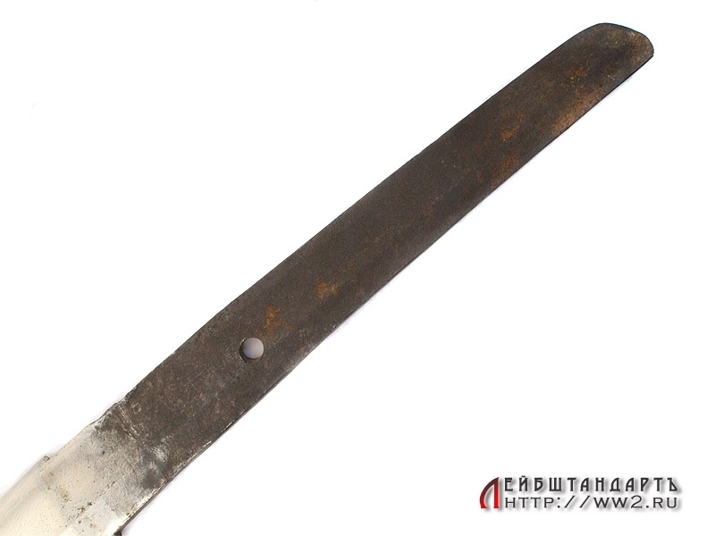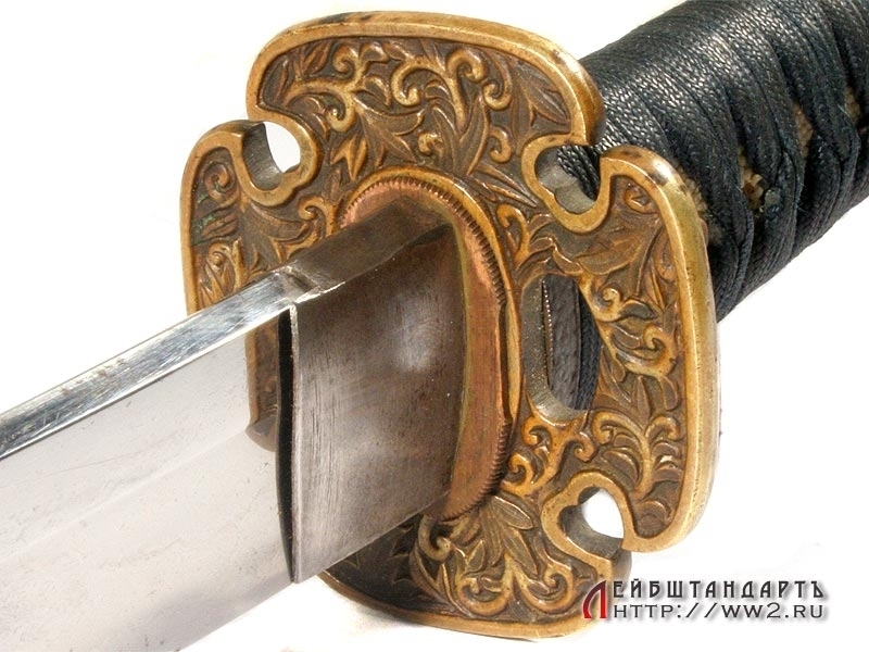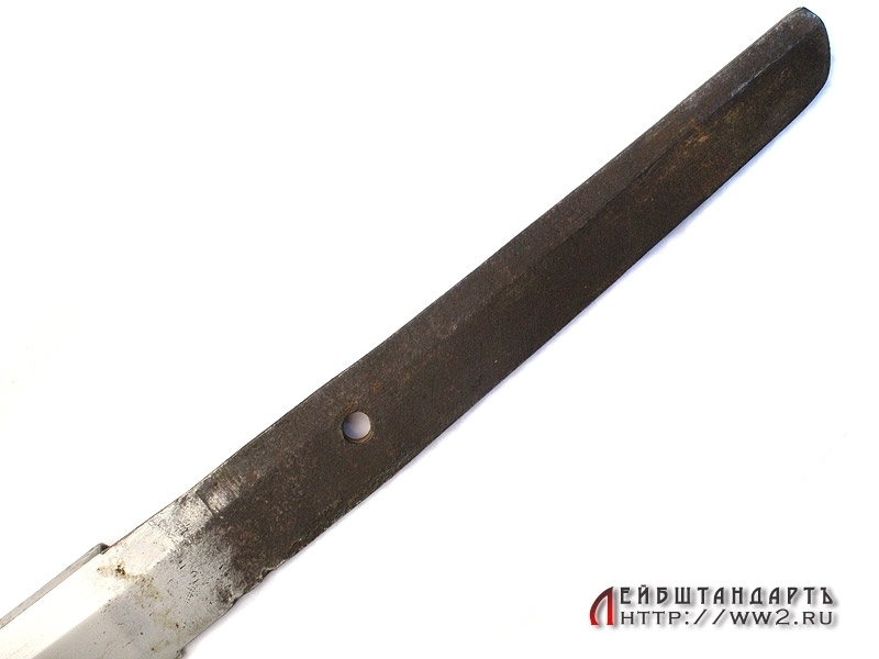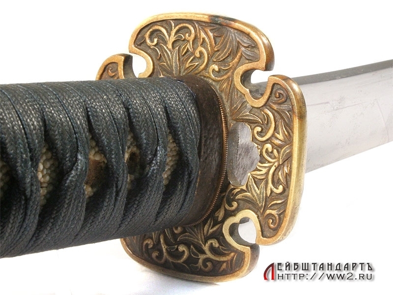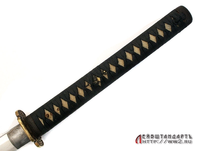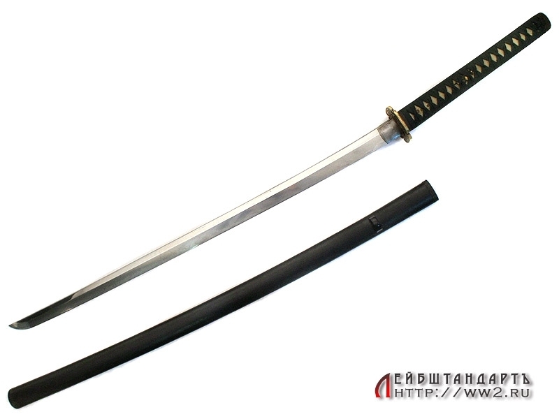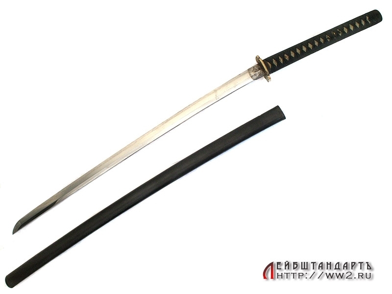 Большой самурайский меч катана в очень хорошем состоянии. Общая длина - 109,5 см, Длина без ножен - 103,5 см, длина клинка - 72,5 см. Клинок незначительной кривизны, с четко выраженной очень красивой линией закалки (хамон), которая хорошо заметна на фотографии. Хвостовик без подписи мастера, имеет одно отверстие для монтировки.