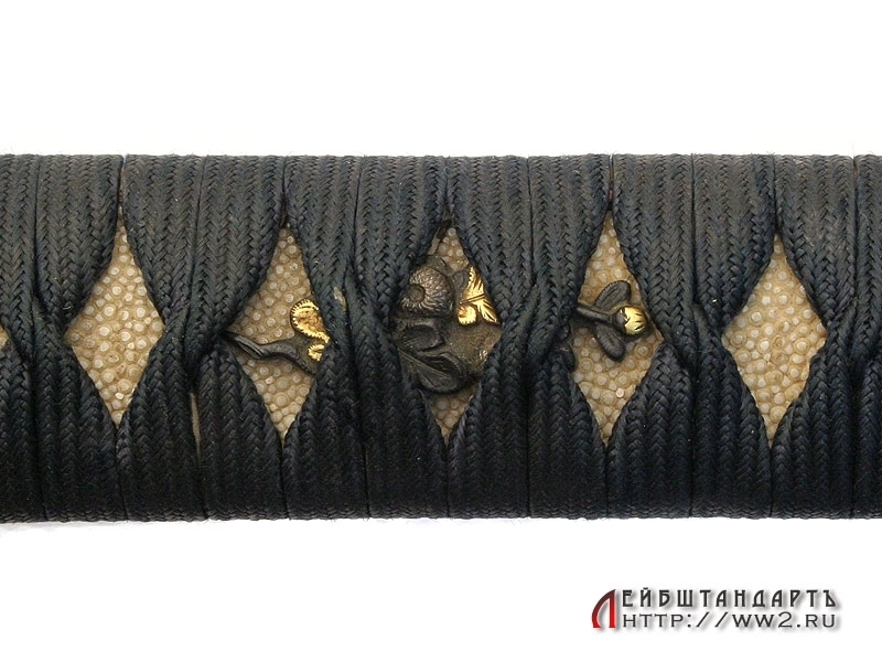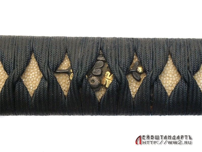 Рукоять деревянная, имеющая подложку из кожи ската (самэ), оплетена шелковым шнуром. Под оплетку вставлены две парные миниатюры (мэнуки), изображающие цветы. Муфта и навершие также парные, декорированные под шагреневую кожу.