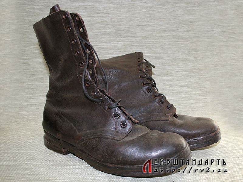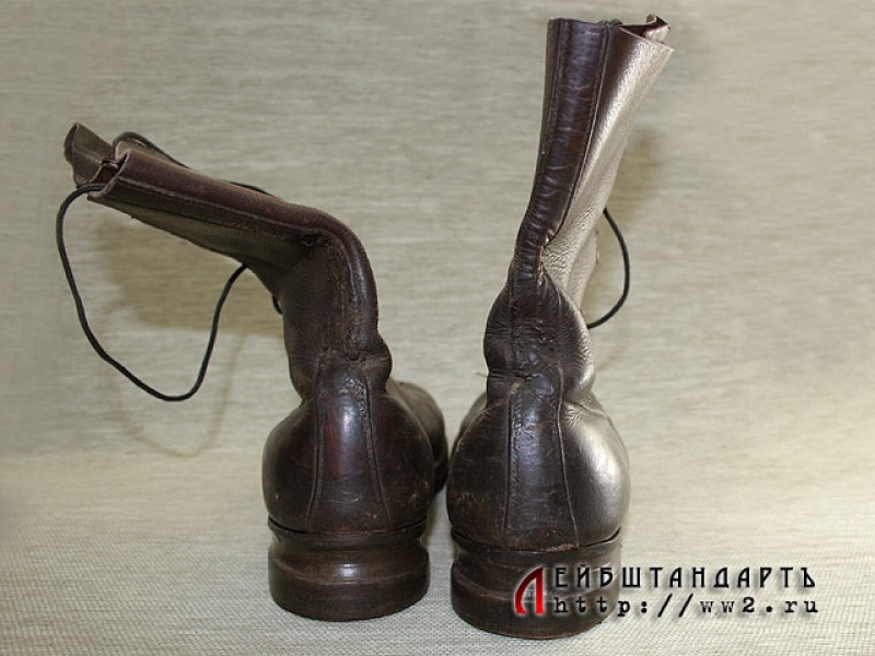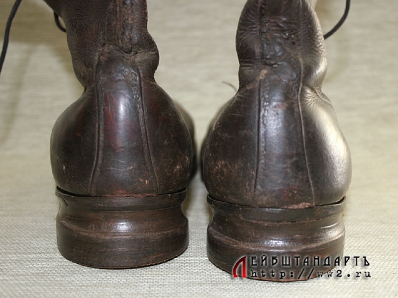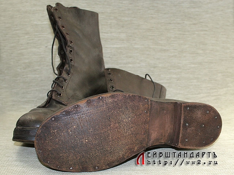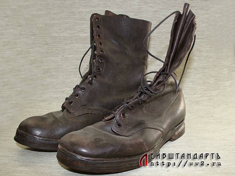 Высокие шнурованные ботинки немецких десантников в хорошем чердачном состоянии, вторая модель. Сшиты из темно-коричневой кожи, которая до сих пор не потеряла эластичность и ботинки вполне пригодны к носке. На голенище имеются клейма: "29 41 8 88". Размер 41. Всё бы хорошо, но "язык" и подмётки стоят послевоенные, т.к. в них ходили, всё остальное оригинальное...