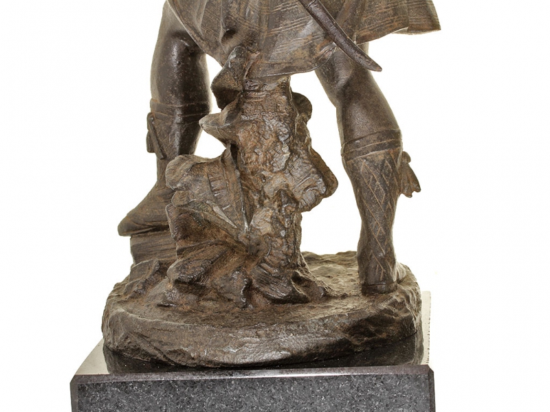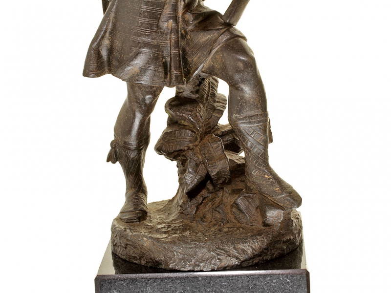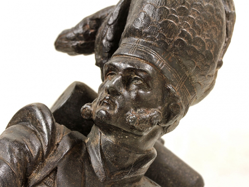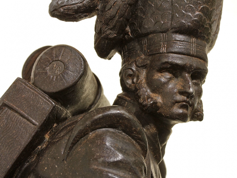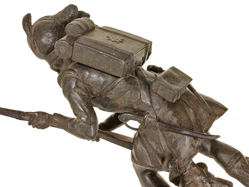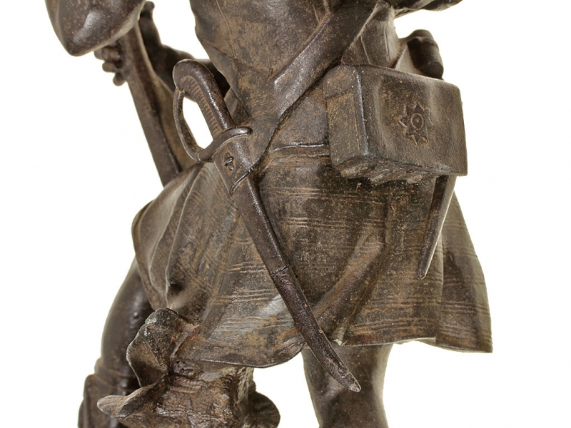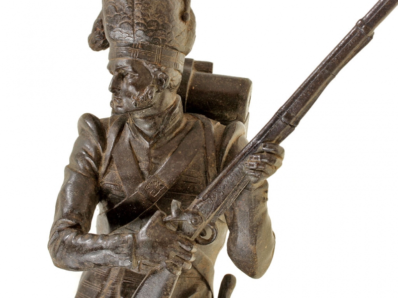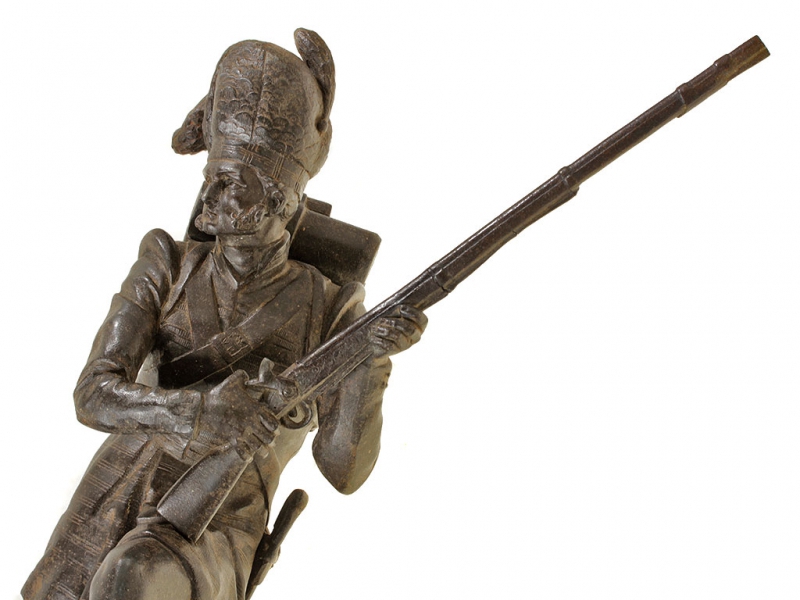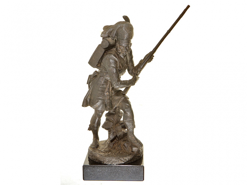 Большая интерьерная статуэтка, изображающая солдата горских шотландских полков периода Крымской кампании в полной выкладке. Солдат вооружен пехотным капсюльным ружьем, курок которого он взводит, готовясь к выстрелу. На лядуночной перевязи хорошо заметна монограмма королевы Виктории. Штык к ружью помещен в кожаных ножнах на поясе с правой стороны, с левой закреплен тесак. Статуэтка изготовлена из цинкового сплава, патинирована, закреплена на подставке из черного мрамора.