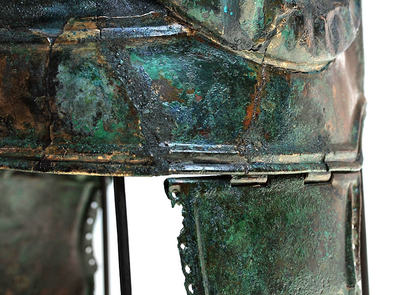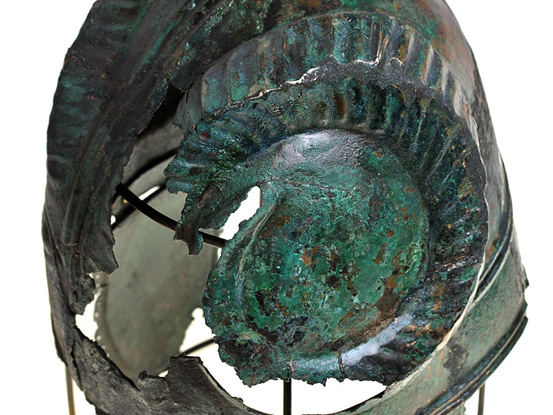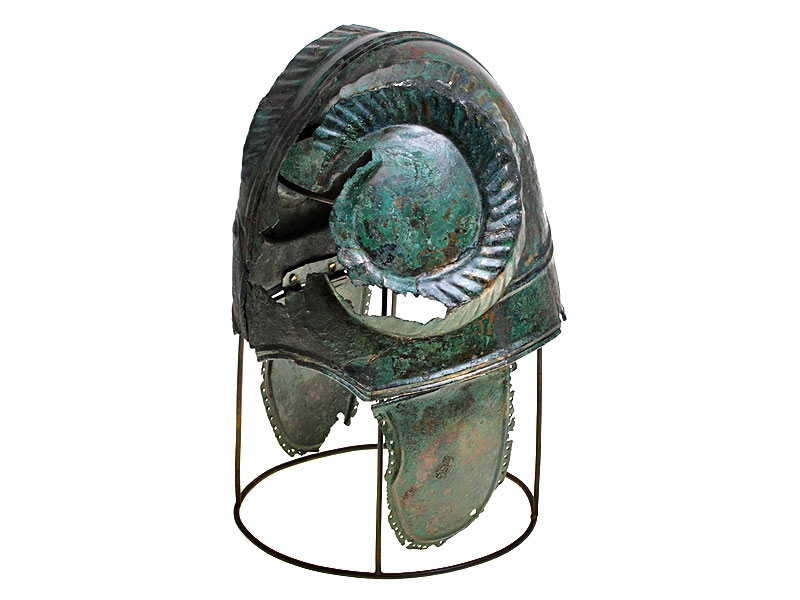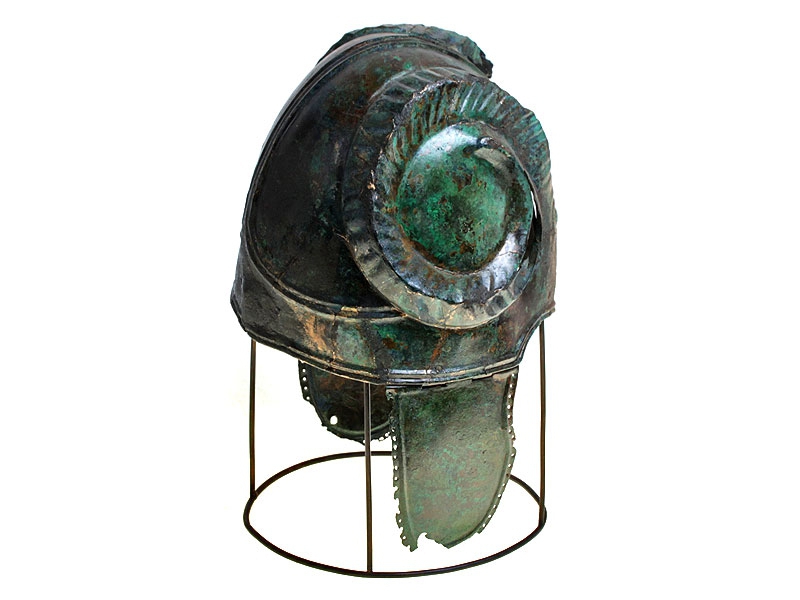 Бронзовый античный шлем, изготовленный в III - II веках до нашей эры. Сфера шлема имеет импровизированный гребень в виде трех низкорельефных выпуклых полос, идущих от лицевой части до затылка, где они симметрично расходятся в стороны. Шов проходит по центру гребня. Край шлема имеет выступающий бортик. Возможно, имелась носовая пластина либо защитный выступ: в этом месте имеется утрата металла. В лобной части шлем декорирован изображениями глаз, один из которых хорошо сохранился. От глаз вверх в височные части расходятся рельефные украшения в виде бараньих рогов. По бокам имеются штифтовые крепления, к которым привешены пластины, защищавшие уши. Пластины окаймлены рельефным бортиком и имеют по краю многочисленные круглые отверстия.