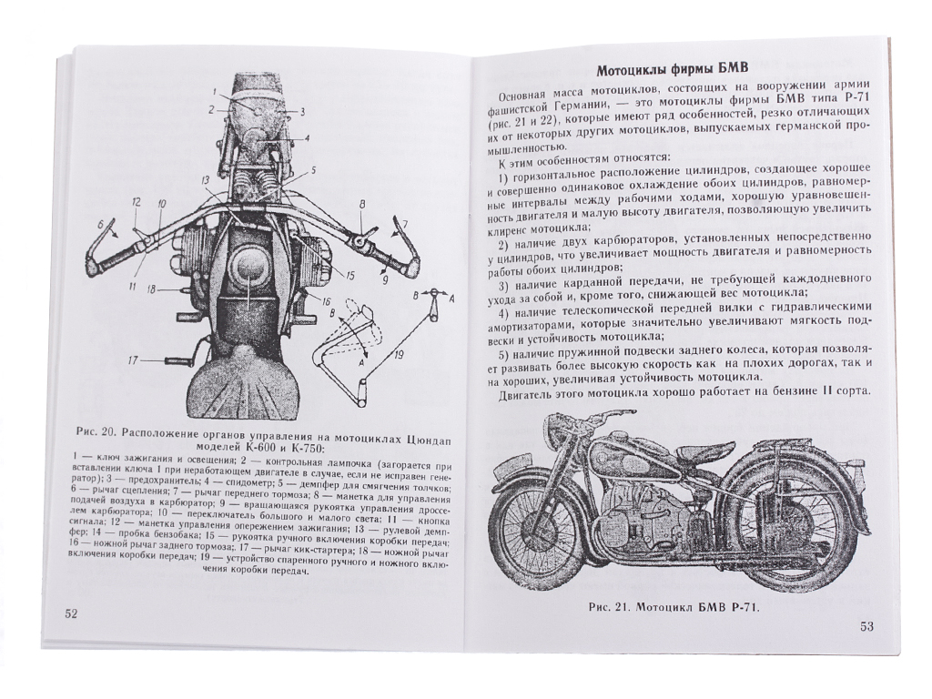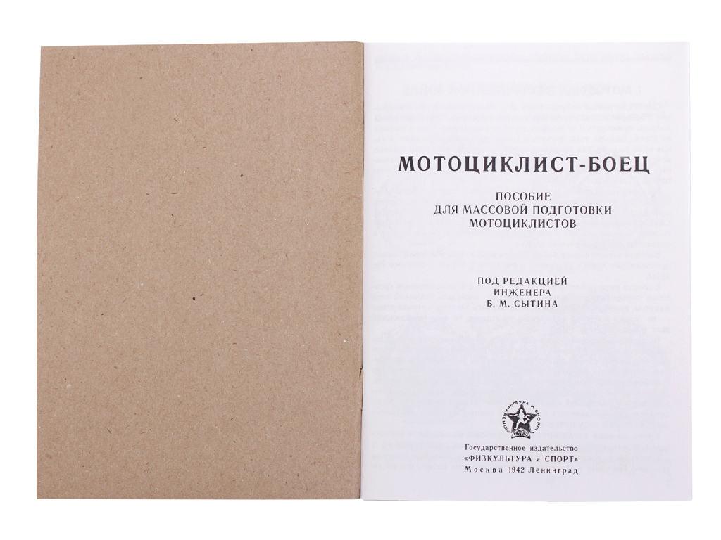 Современный репринт брошюры "Мотоциклист - боец" под редакцией инженера Б.М. Сытина, выпущенной издательством "Физкультура и спорт" в Москве в 1942 году.