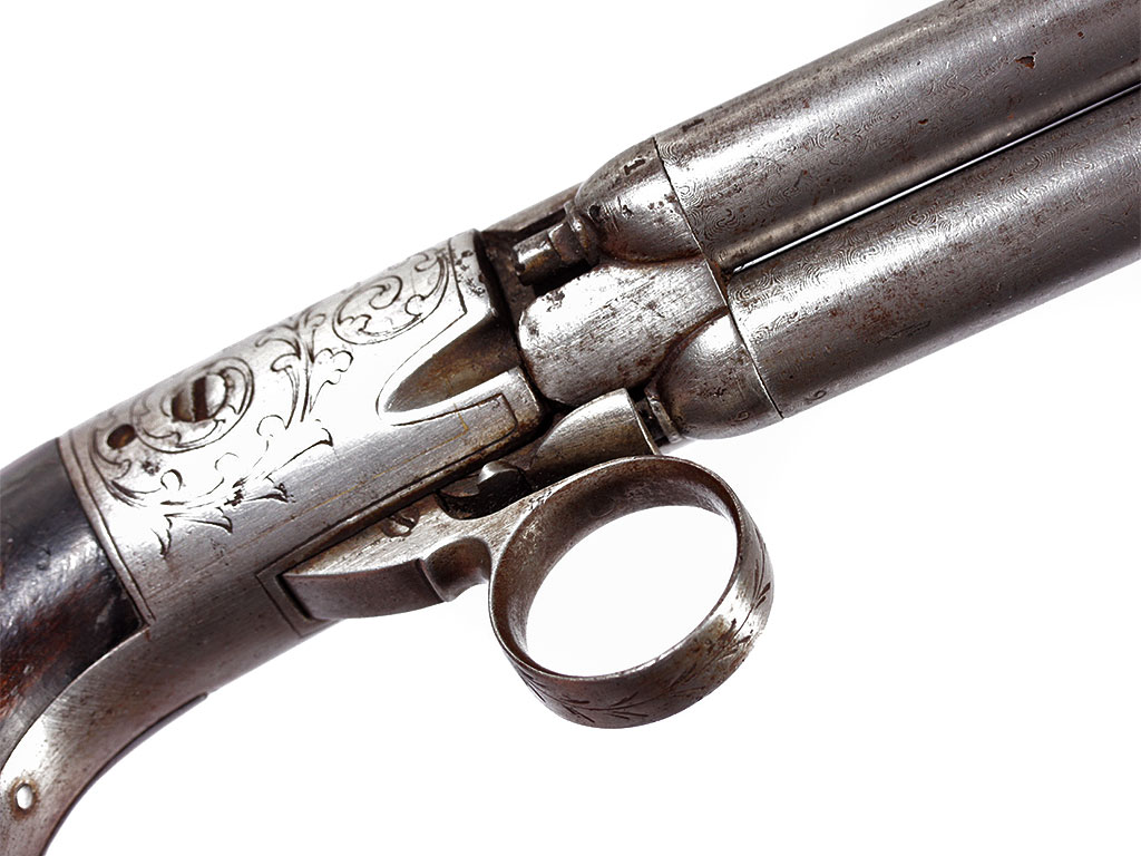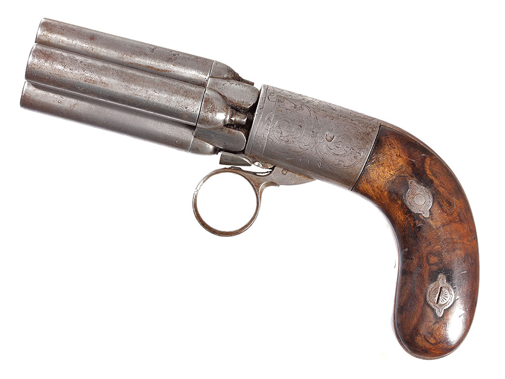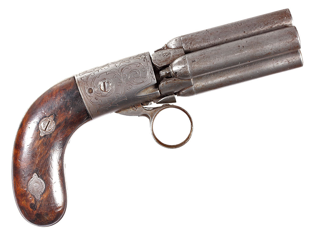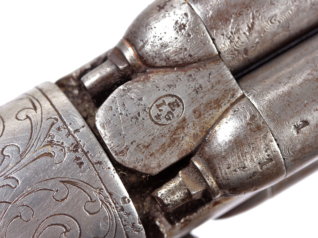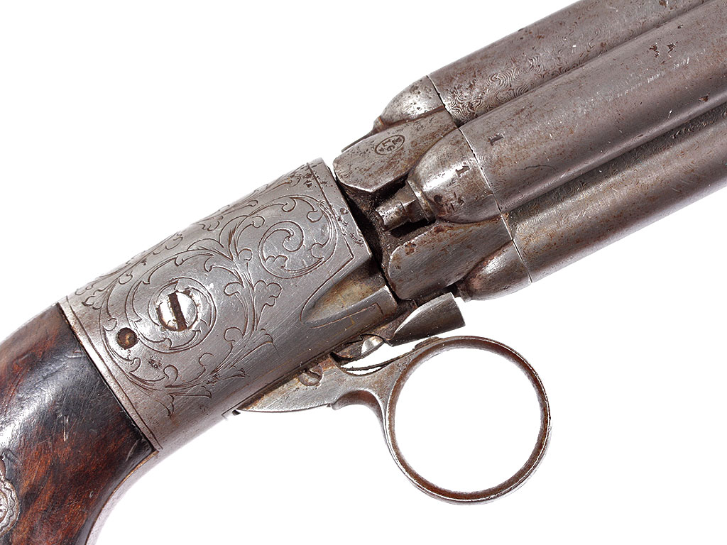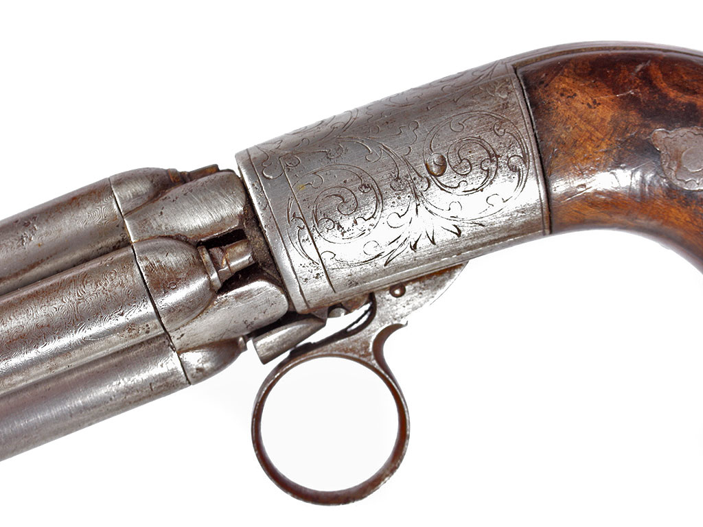 Капсюльный бундельревольвер ("Pepperbox") бельгийского производства системы Мариетта второй четверти - середины XIX века. Рабочая часть представляет собой вращающуюся при нажатии на спусковую скобу связку из четырех стволов. Стволы дамаскированные, каждый ствол отвинчивается от основания по отдельности при помощи специальной отвертки, для которой со стороны дульного среза в каждом стволе присутствуют крестообразные надпилы. Капсюльный замок помещен снизу у основания спусковой скобы, что допускает стрельбу только самовзводом, без предварительного взведения курка. У основания стволов имеется соответствующая нумерация - дабы не перепутать стволы после чистки. Спинка рукояти и ее основание стальные, украшены гравированным штихелем вручную растительным орнаментом. У основания стволов - льежское клеймо. Накладки из орехового дерева.