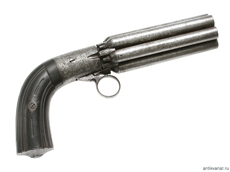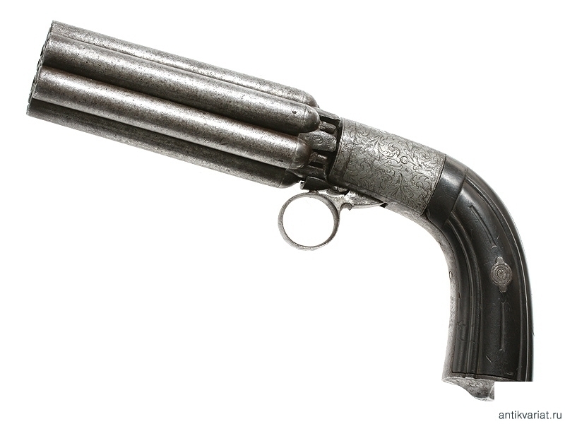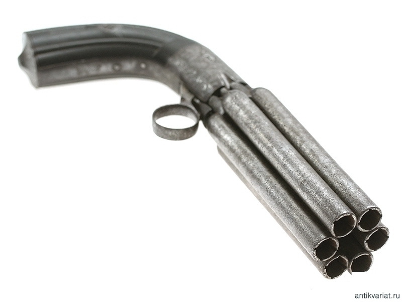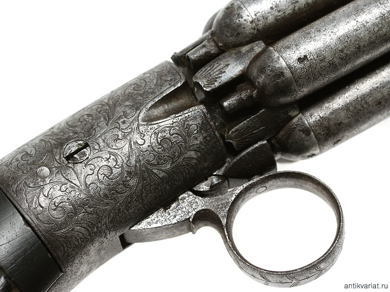 Капсульный бундельревольвер бельгийского производства системы Мариетта второй четверти - середины XIX века. Рабочая часть представляет собой вращающуюся при нажатии на спусковую скобу связку из шести стволов. Стволы изготовлены из дамасской стали, гладкие, каждый ствол отвинчивается от основания по отдельности при помощи специальной отвертки, для которой со стороны дульного среза в каждом стволе присутствуют крестообразные надпилы. Капсульный замок помещен у основания спусковой скобы, что допускает стрельбу только самовзводом, без предварительного взведения курка. У основания связки между брандтрубками имеются следующие клейма: заводское "E.L.G.", а также нумерацию стволов. Спинка рукояти и ее основание стальные, украшены гравированным штихелем вручную растительным орнаментом. Накладки черного дерева.