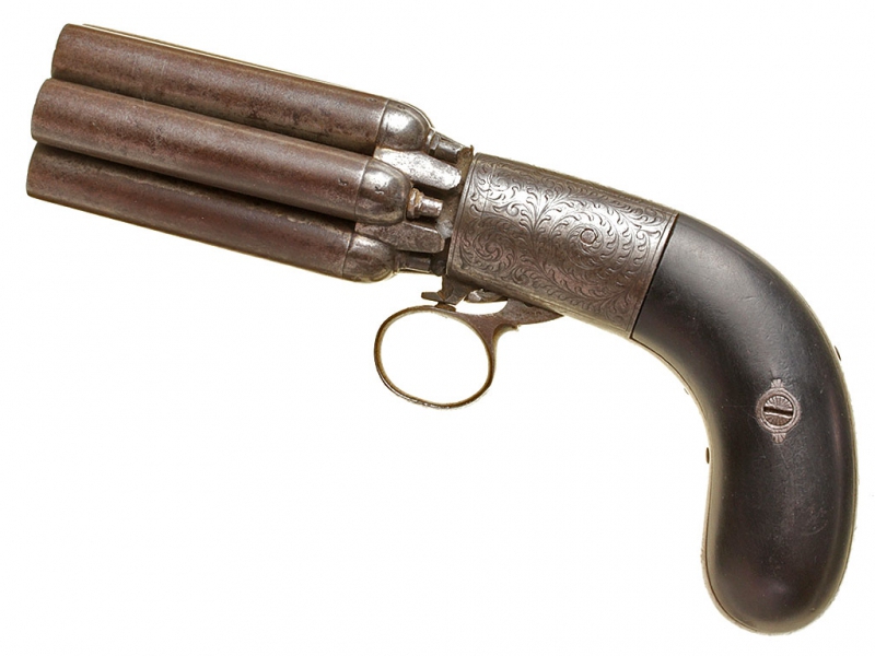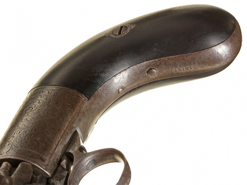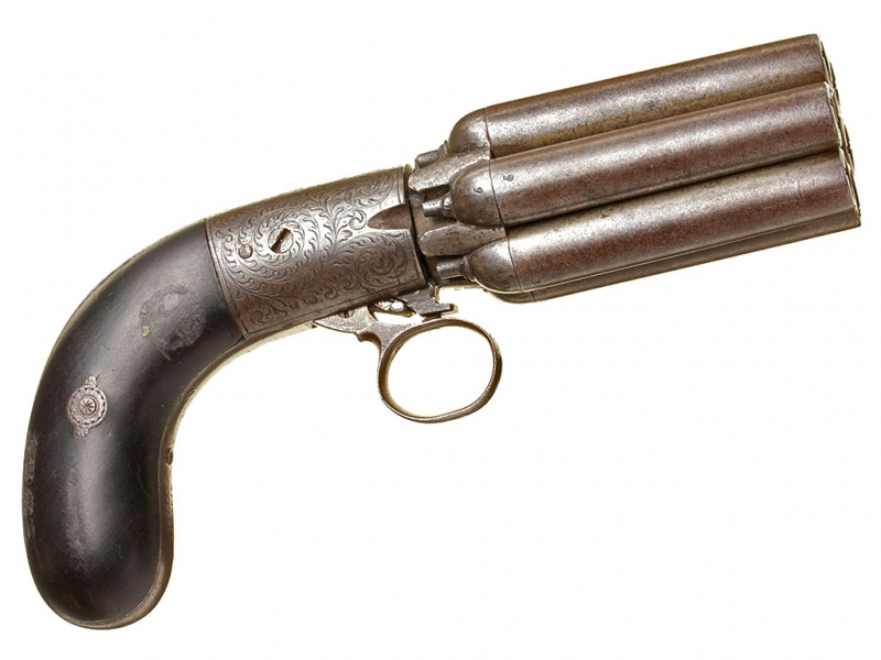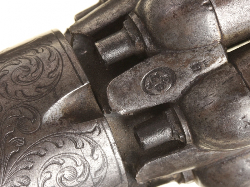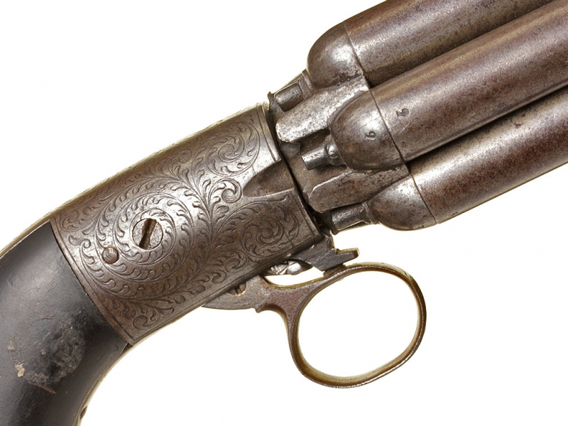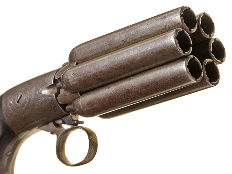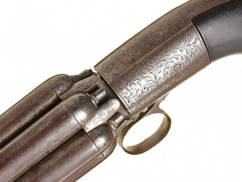 Капсюльный бундельревольвер бельгийского производства системы Мариетта второй четверти - середины XIX века. Рабочая часть представляет собой вращающуюся при нажатии на спусковую скобу связку из шести стволов. Стволы дамаскированные, каждый ствол отвинчивается от основания по отдельности при помощи специальной отвертки, для которой со стороны дульного среза в каждом стволе присутствуют крестообразные надпилы. Капсюльный замок помещен снизу у основания спусковой скобы, что допускает стрельбу только самовзводом, без предварительного взведения курка. У основания стволов имеется соответствующая нумерация - дабы не перепутать стволы после чистки. Спинка рукояти и ее основание стальные, украшены гравированным штихелем вручную растительным орнаментом. У основания рукояти - клеймо "Mariette Brevete". Накладки на рукояти из черного дерева.