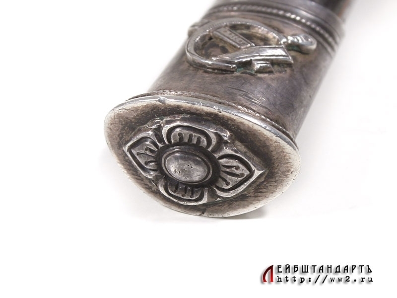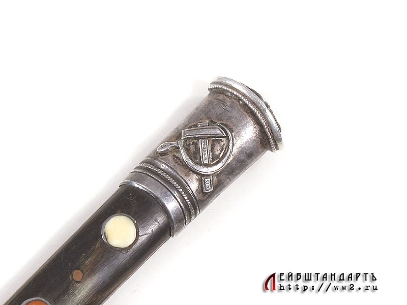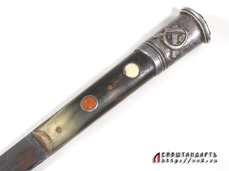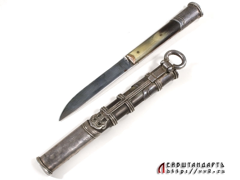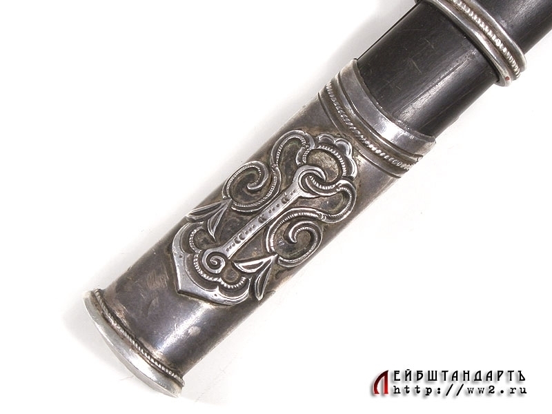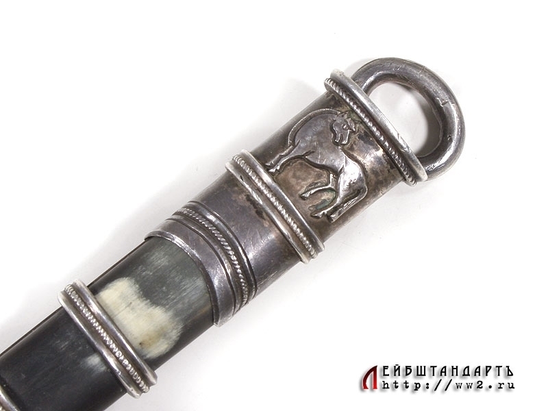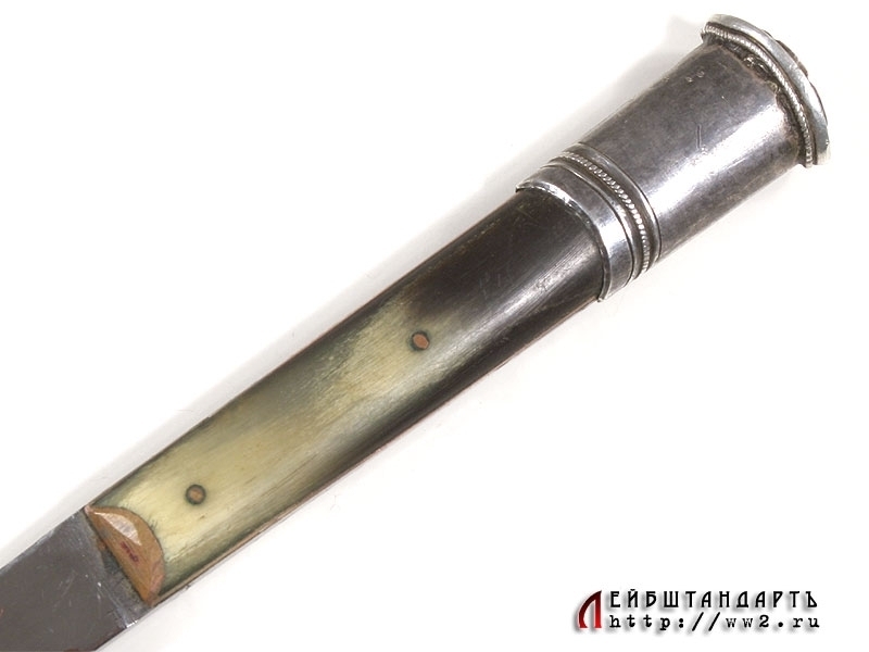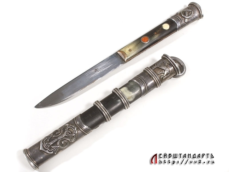 Нож, изготовленный в традиционном бурятском стиле в 1930-е годы, в превосходном состоянии. Клинок никелированный, накладки на рукояти изготовлены из окрашенного рога с двумя вставками с лицевой стороны: одна из слоновой кости, другая из коралла. Подобные материалы традиционно ввозились в Бурятию для украшения национальных костюмов и инкрустации бронзовых буддийских храмовых скульптур. Навершие рукояти изготовлено из серебра и украшено с лицевой стороны накладным изображением серпа и молота. Ножны роговые, снабжены серебряными устьем, наконечником и двумя гайками. Устье украшено накладной фигуркой лошади, традиционно имевшей в бурятской мифологии благопожелательное значение; наконечник снабжен накладным стилизованным изображением якоря. Аналогично украшен и подвес ножен, благодаря кольцу напоминающий удлиненный якорь.