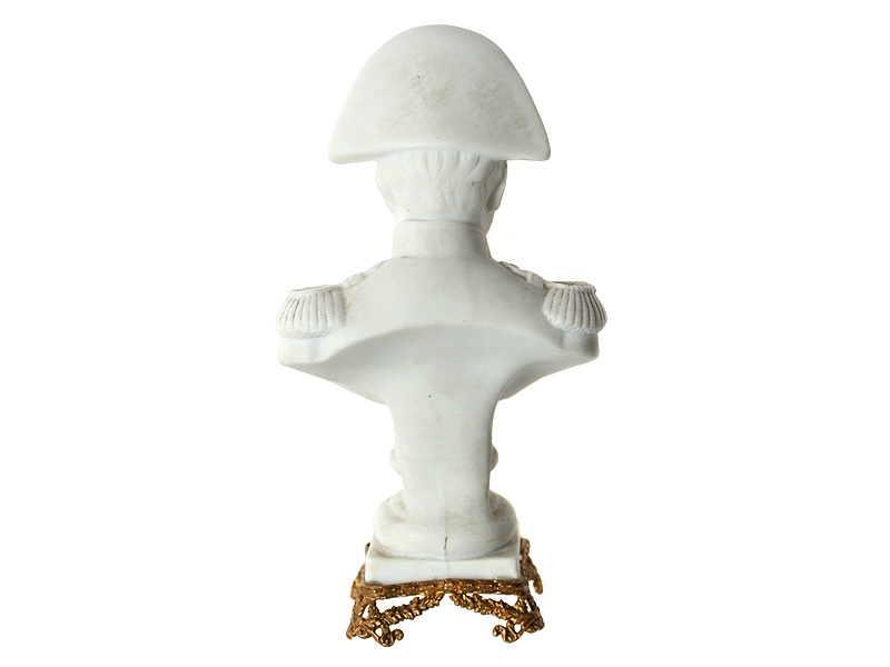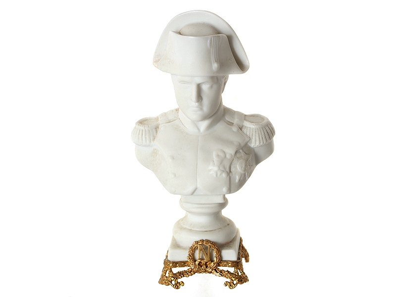 Бюст Императора Наполеона Бонапарта, изготовленный из неглазурованного белого фарфора (бисквита). Основание бюста - в золоченой бронзовой оплетке с вензелем Императора. На дне имеется надглазурная марка мастерской, подражающая знаку Мейсенской мануфактуры. Начало ХХ века.