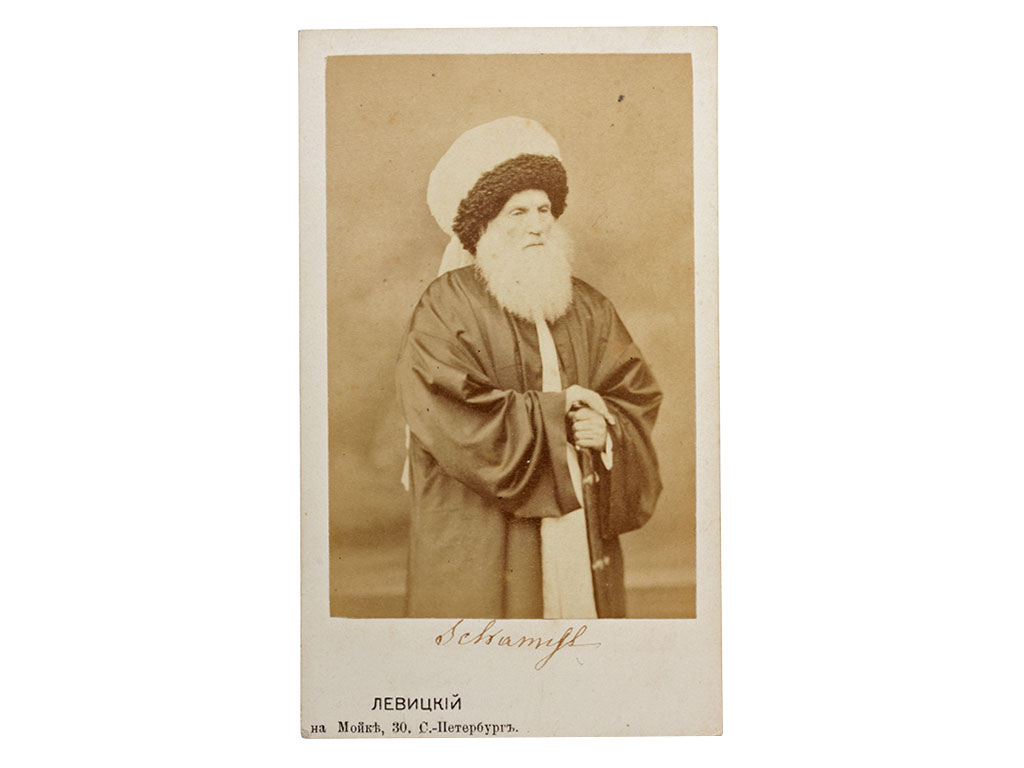 Национальный герой народов Северного Кавказа имам Шамиль изображен в традиционной одежде, стоя, опираясь на шашку. Фотография сделана во время посещения Шамилем Санкт-Петербурга, либо в 1861 году, когда он прибыл из ссылки на встречу с Императором Александром II, либо в 1866 году, когда Шамиль вновь встречался с Императором и был приглашен на свадьбу цесаревича Александра.