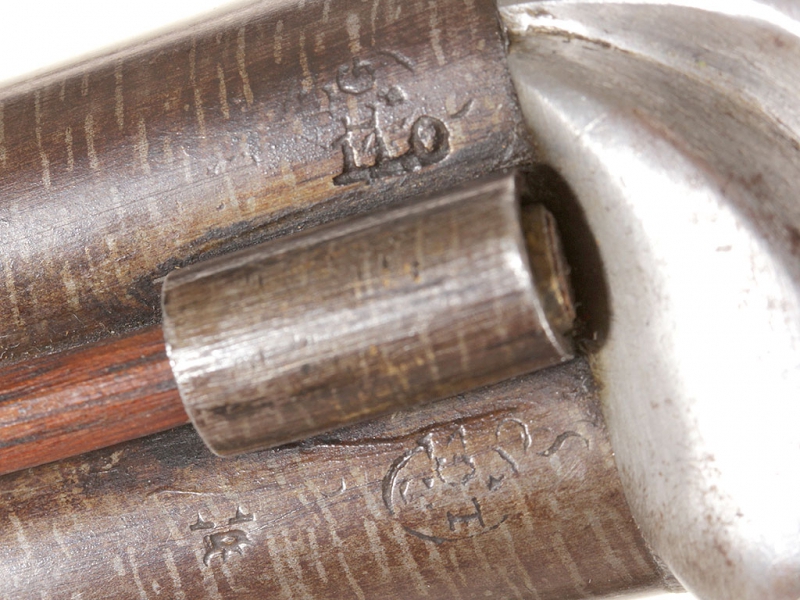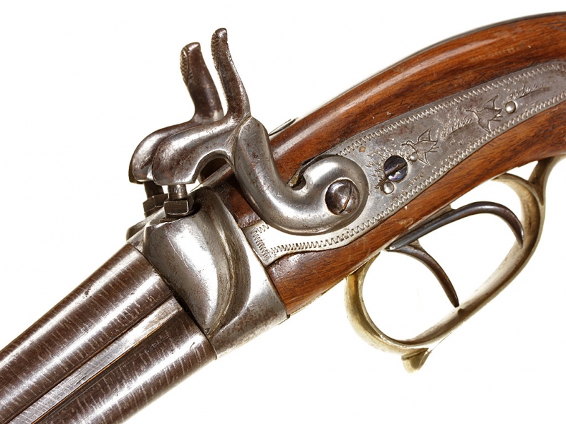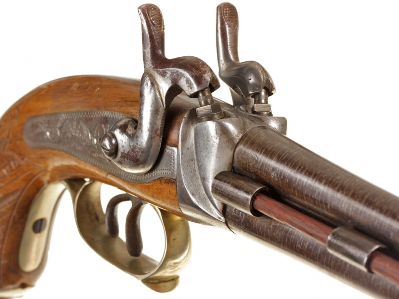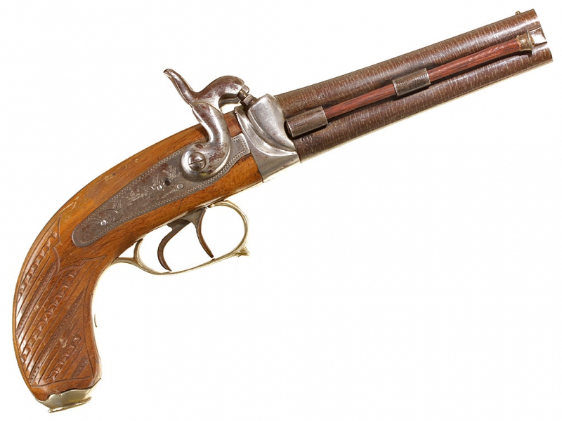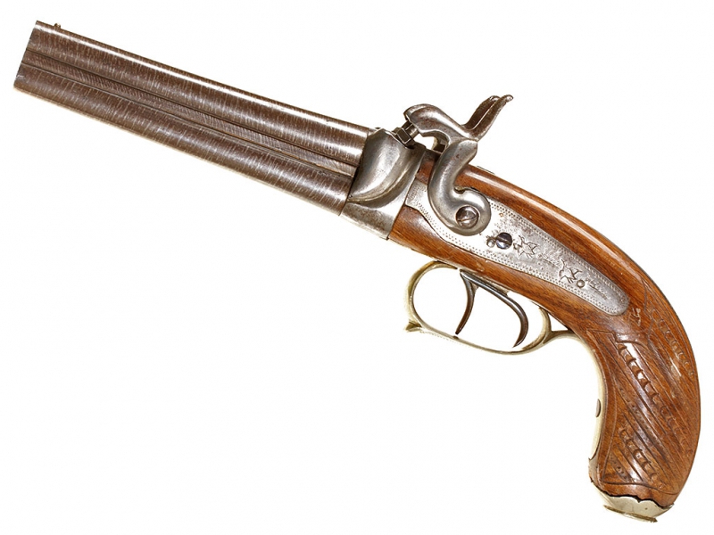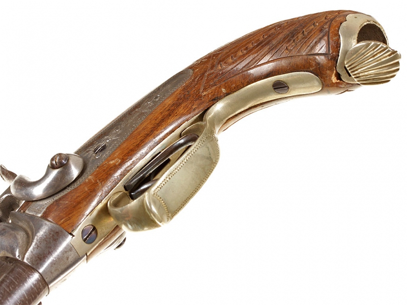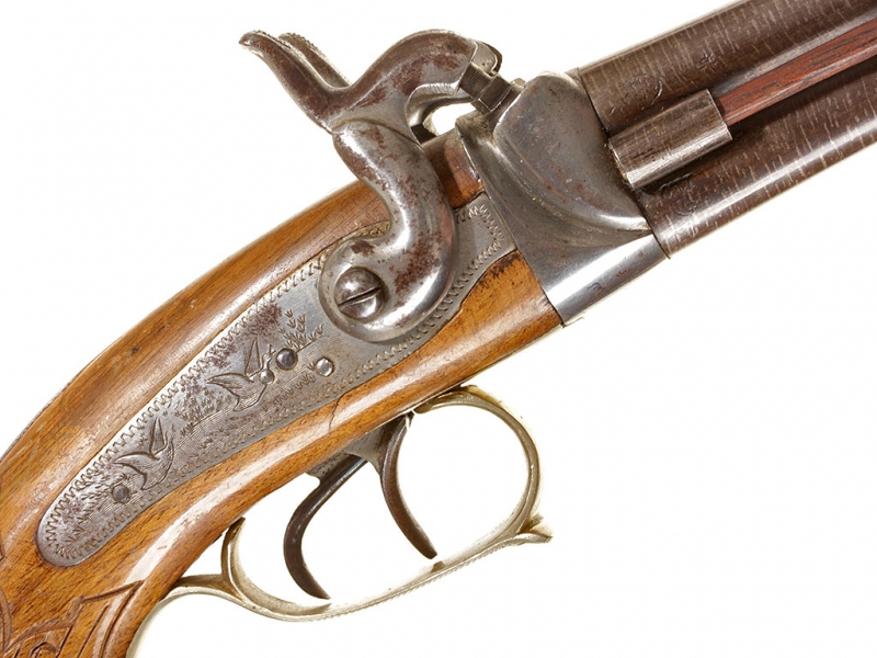 Двуствольный дорожный пистолет с капсульным замком, изготовленный во второй трети - середине XIX века. Стволы гладкие, дамаскированные, с клеймами Льежского арсенала. Пластины замков украшены гравированными изображениями летящих птиц. Скоба мельхиоровая, гладкая. Деревянная рукоять покрыта наклонными рифлеными желобками для удобства удержания оружия в руке, металлическая накладка в основании рукояти имеет откидную крышку: внутри рукояти имеется пенал для хранения капсюлей. Замки полностью исправны.