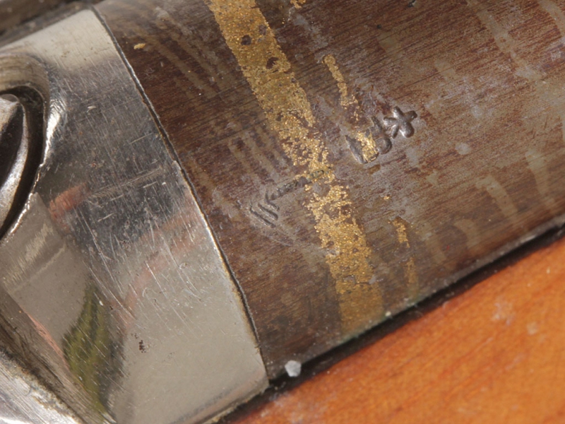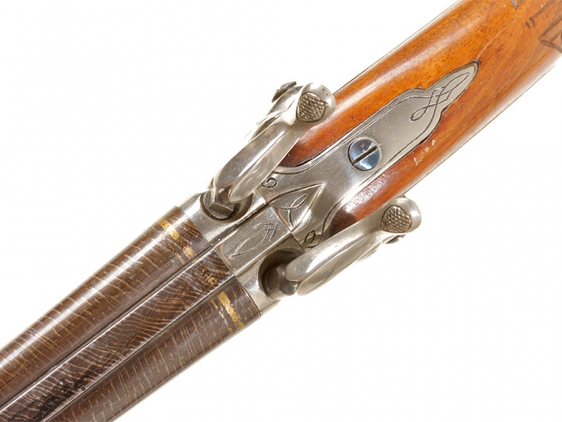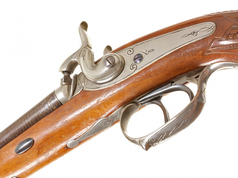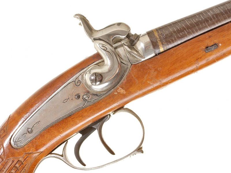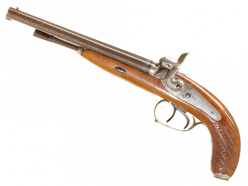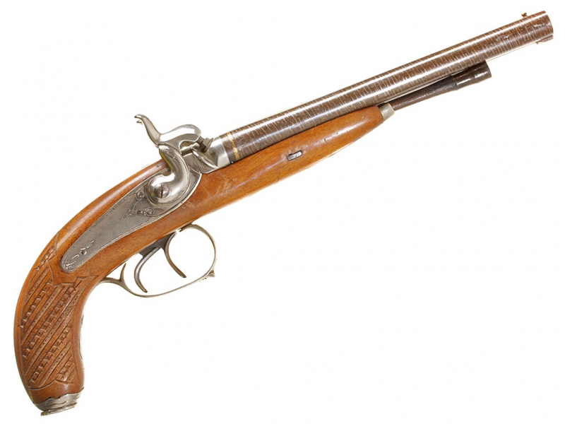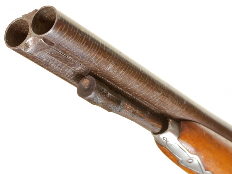 Двуствольный дорожный пистолет с капсульным замком, изготовленный во второй трети - середине XIX века. Стволы гладкие, дамаскированные, с золотой наводкой у основания, на правом стволе имеется нечитаемое приемочное клеймо. Пластины замков гладкие, мельхиоровые. Скоба также мельхиоровая, гладкая. Деревянная рукоять покрыта наклонными рифлеными желобками для удобства удержания оружия в руке, металлическая накладка в основании рукояти имеет откидную крышку: внутри рукояти имеется пенал для хранения капсюлей. Замки полностью исправны.