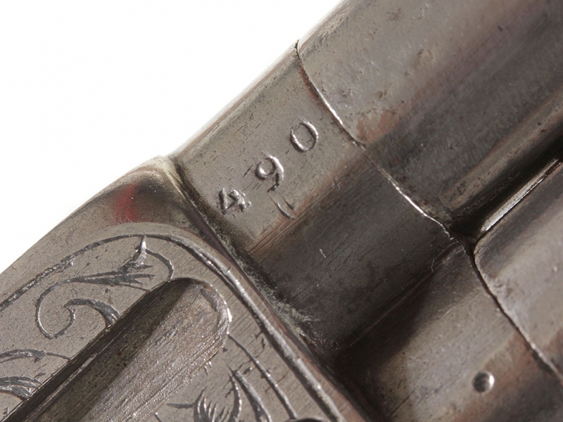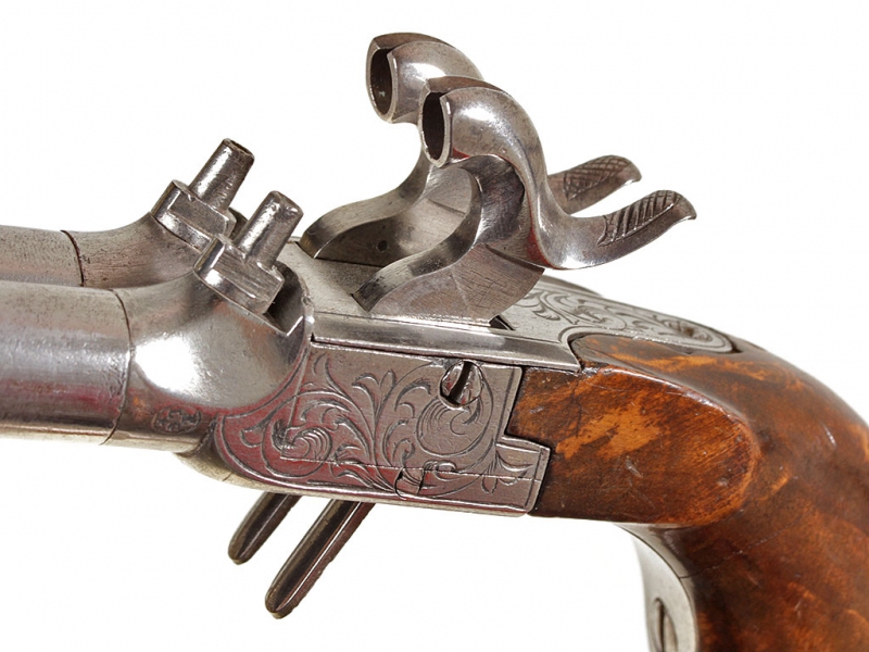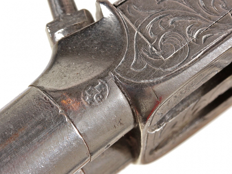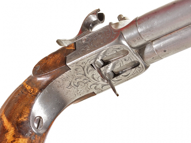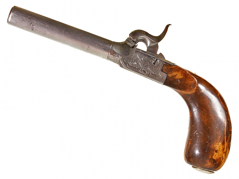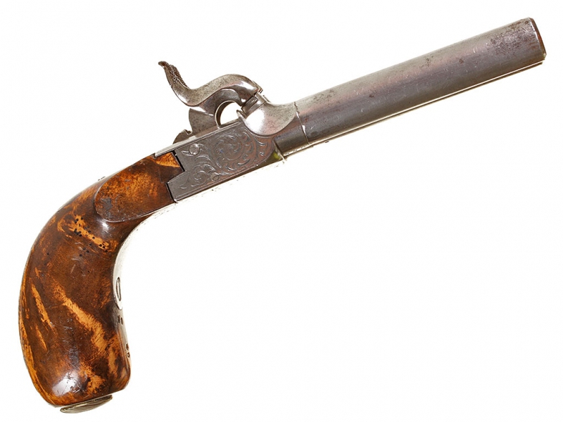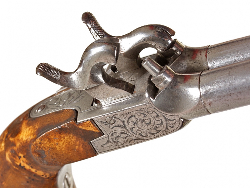 Двуствольный жилетный пистолет с капсульным замком, изготовленный во второй трети - середине XIX века. Стволы гладкие, с клеймами Льежского арсенала. Пластины замков украшены гравированным орнаментом. Скоба мельхиоровая, гладкая. Деревянная рукоять гладкая, металлическая накладка в основании рукояти имеет откидную крышку: внутри рукояти имеется пенал для хранения капсюлей. Замки полностью исправны.