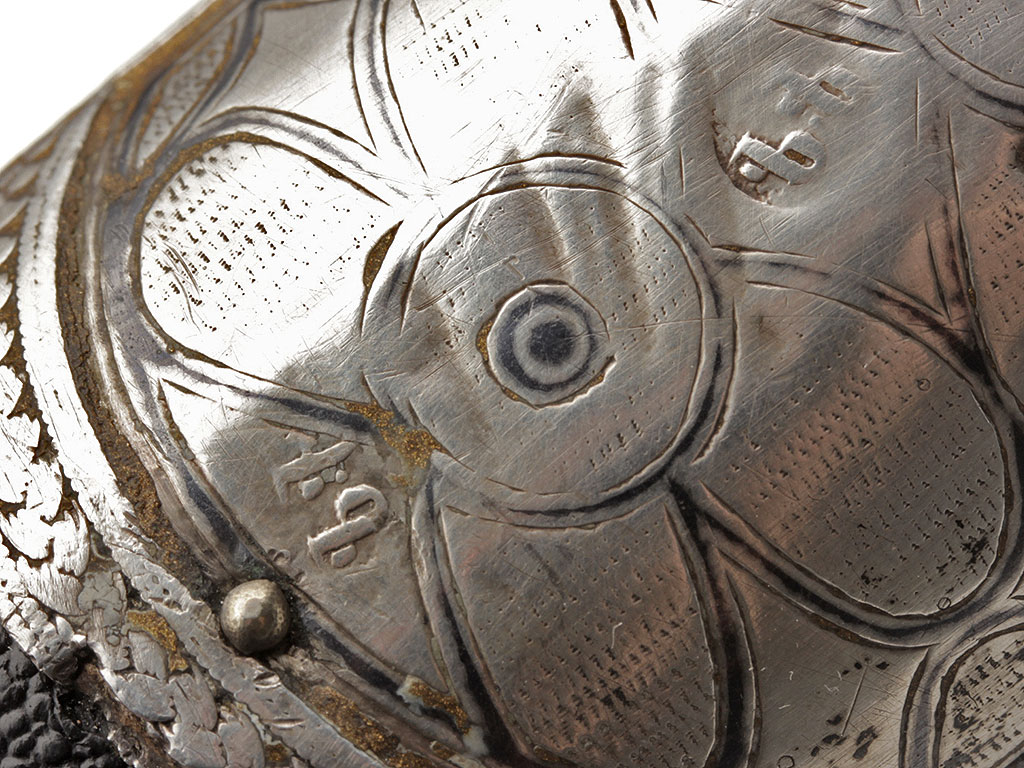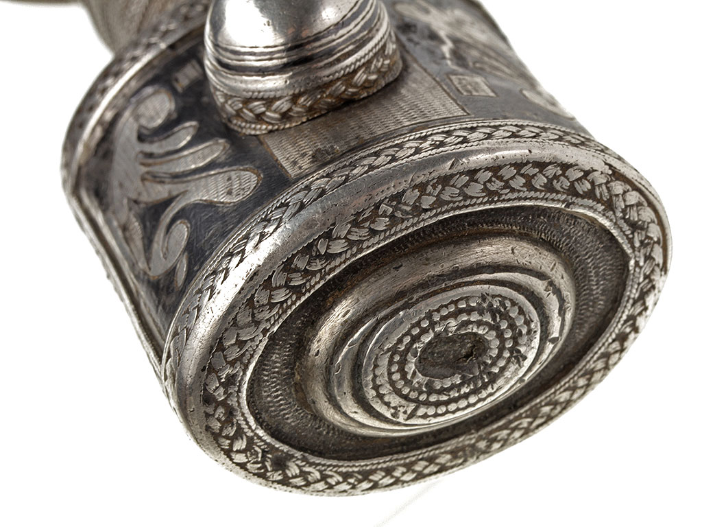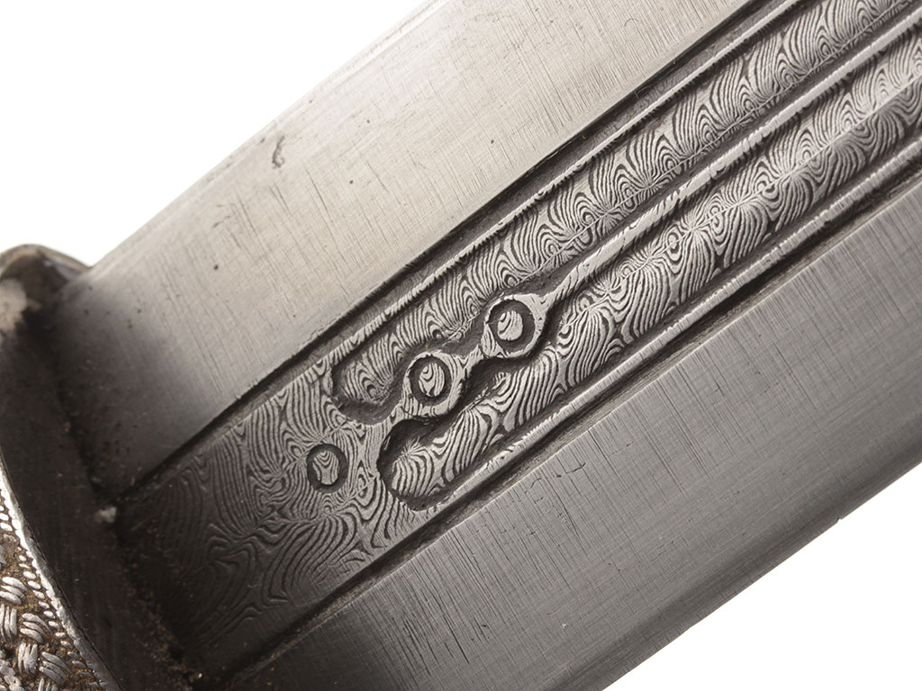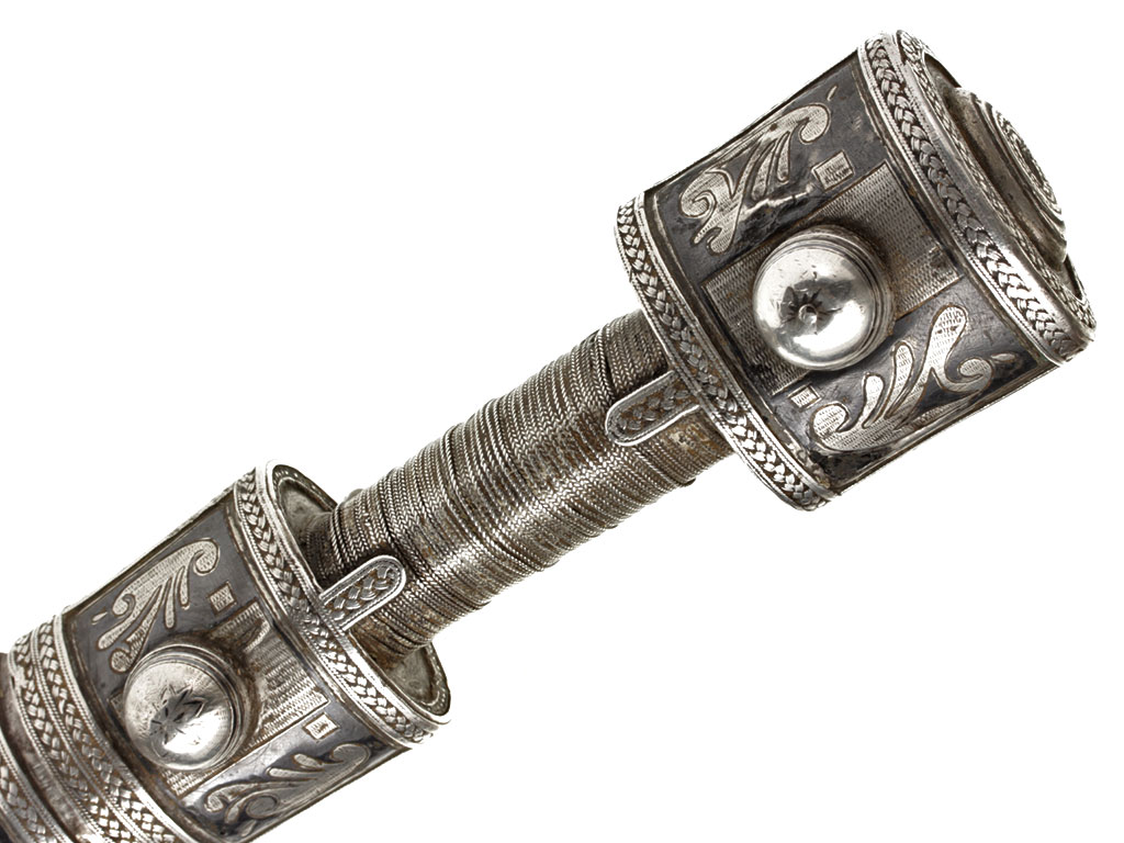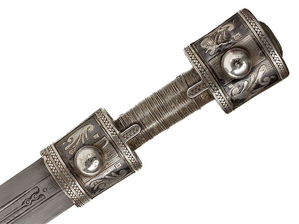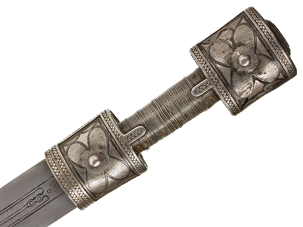 Рукоять имеет деревянную основу и сплошь обложена серебром, скреплена с хвостовиком клинка двумя стальными заклепками. С лицевой стороны заклепки закрыты массивными шляпками сферической формы, украшенными растительным орнаментом и чернью. Сама рукоять объемная, черен рукояти практически круглого сечения, обмотан витой серебряной проволокой. Верхняя и нижняя обоймицы рукояти богато украшены геометрическим орнаментом и чернью.