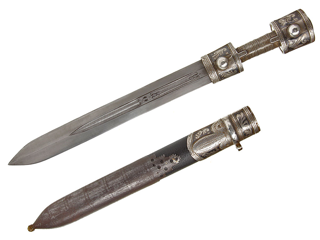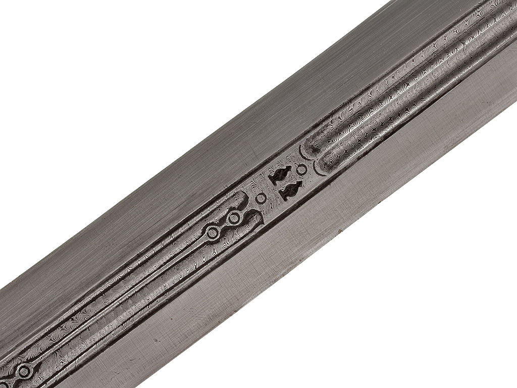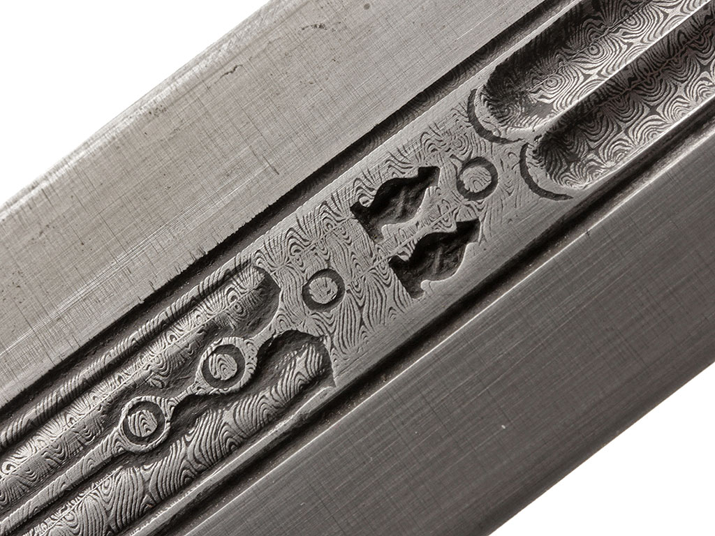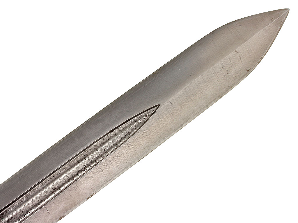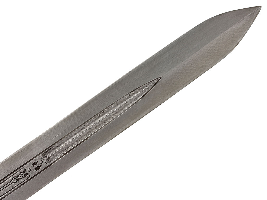 Клинок прямой, ромбического сечения, двулезвийный, с двумя узкими долами. В центральной части клинка и долах мастером протравлен мелкий спиралевидный узор, имитирующий структуру стали. С лицевой стороны имеются два миниатюрных фигурных клейма.