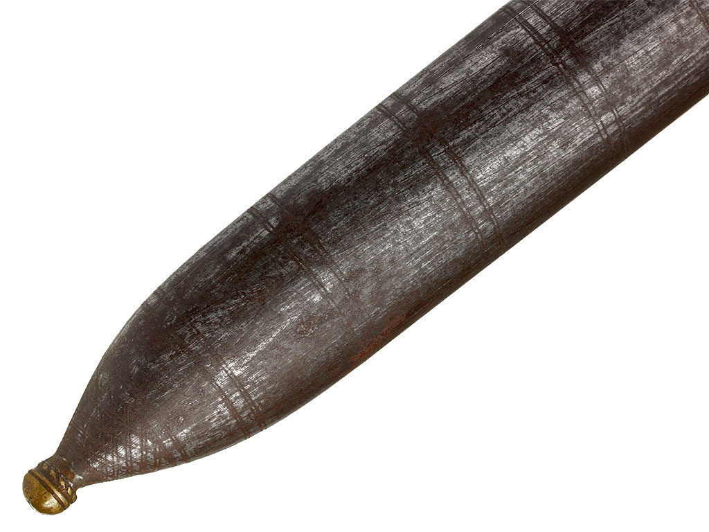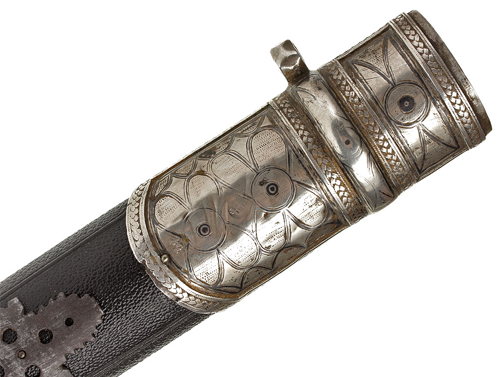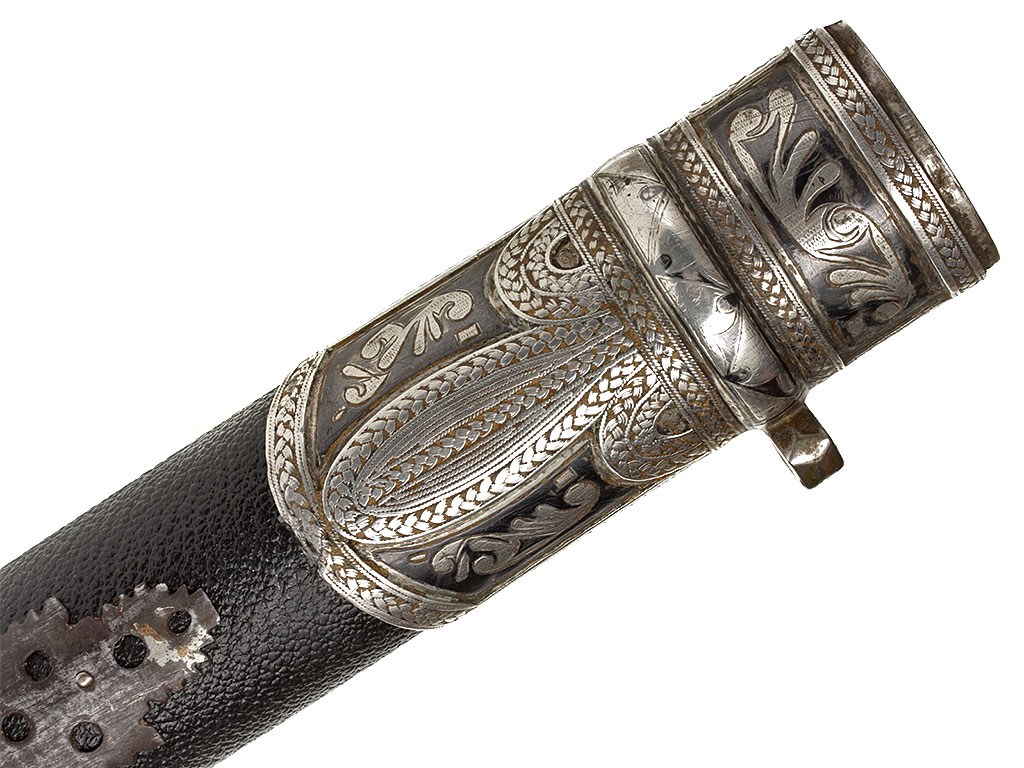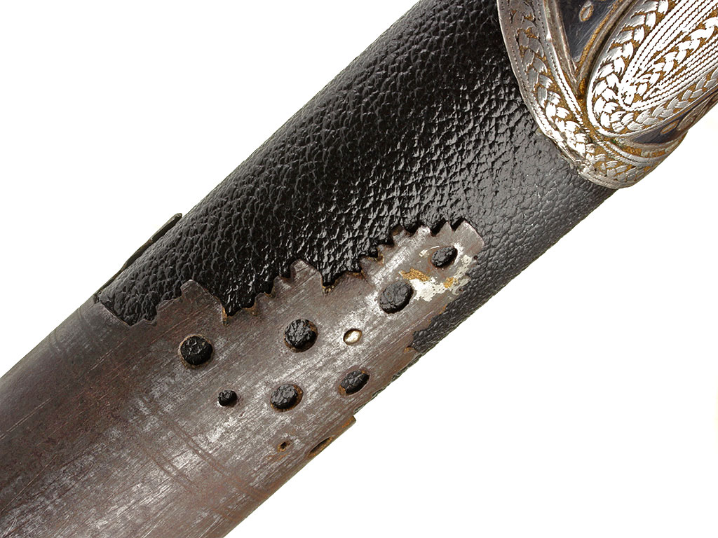 Ножны деревянные, обтянутые черной глянцевой верблюжьей кожей. Ножны, как и рукоять, очень объемные, овального сечения - не плоские, как у большинства кавказских кинжалов. Металлический прибор состоит из серебряного устья, украшенного геометрическим орнаментом и чернью, и массивного металлического наконечника с каплевидным завершением, имеющего следы серебрения. Обоймица на устье ножен имеет боковое завершение в виде неподвижного граненого кольца, к которому крепился ремень для подвешивания оружия к поясу. На оправе имеются клейма мастера, выраженные двумя буквами грузинского алфавита.