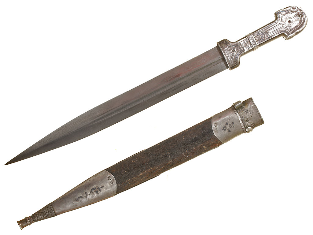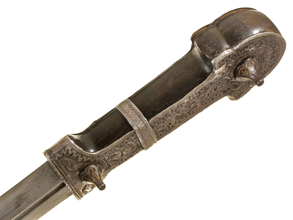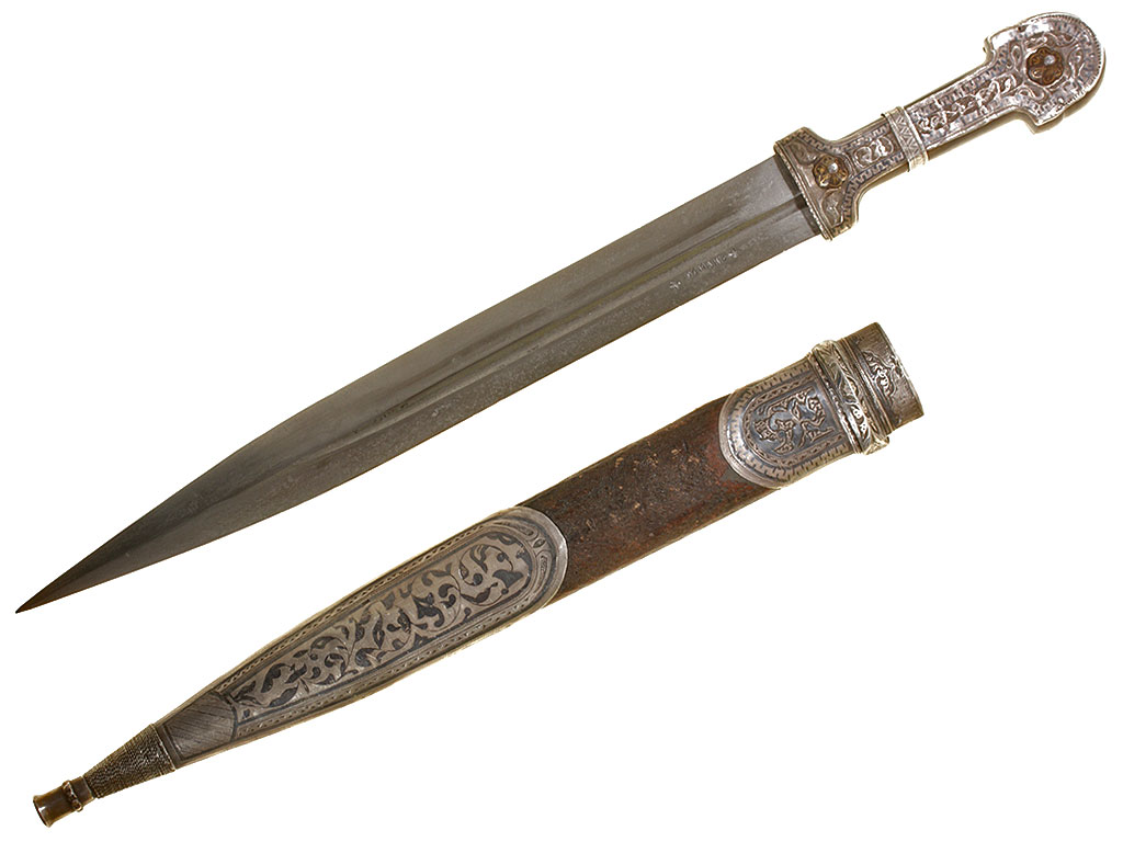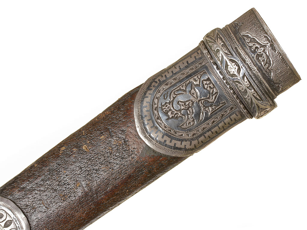 Традиционный кавказский кинжал, изготовленный в конце ХIХ века. Клинок ромбического сечения, с одним узким долом на каждой стороне. С лицевой стороны у основания клинка - клеймо "Османъ". Рукоять из черного рога, с обеих сторон покрыта серебряными накладками, украшенными гравированным геометрическим и растительным орнаментом. Ножны деревянные, обтянутые темно-коричневой кожей. Устье и наконечник ножен серебряные, украшены гравированным орнаментом, покрытым чернью. Все серебряные элементы оправы имеют одинаковые пробирные клейма "84" с эмблемой Тифлисской пробирной палатки (клеймо данной конфигурации использовалось с 1887 по 1899 год) и клеймо неизвестного мастера, выраженное буквами грузинского алфавита.