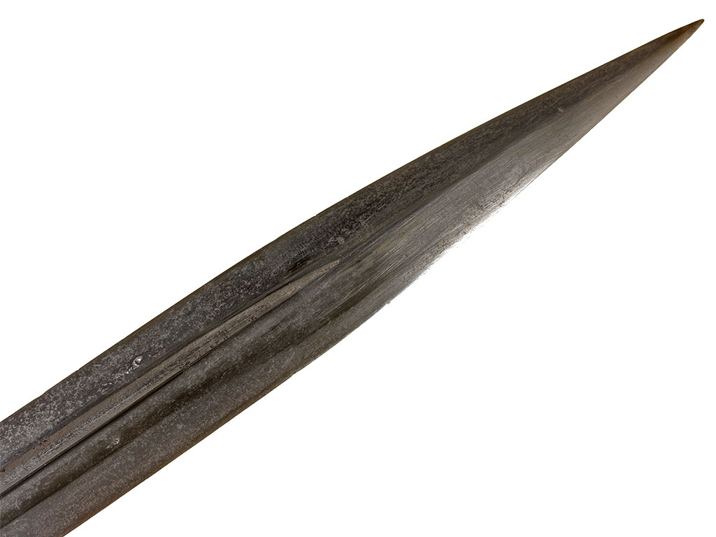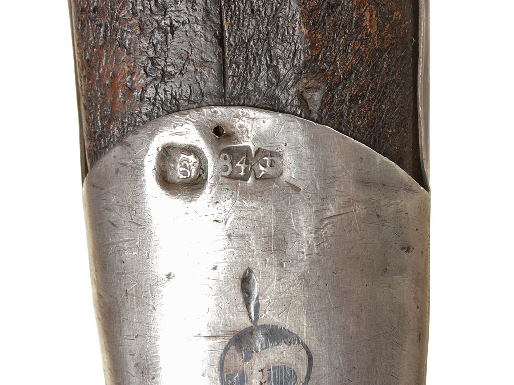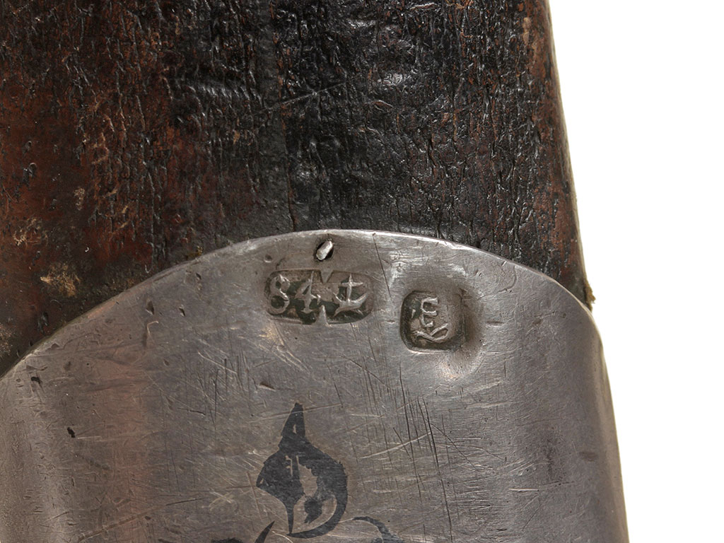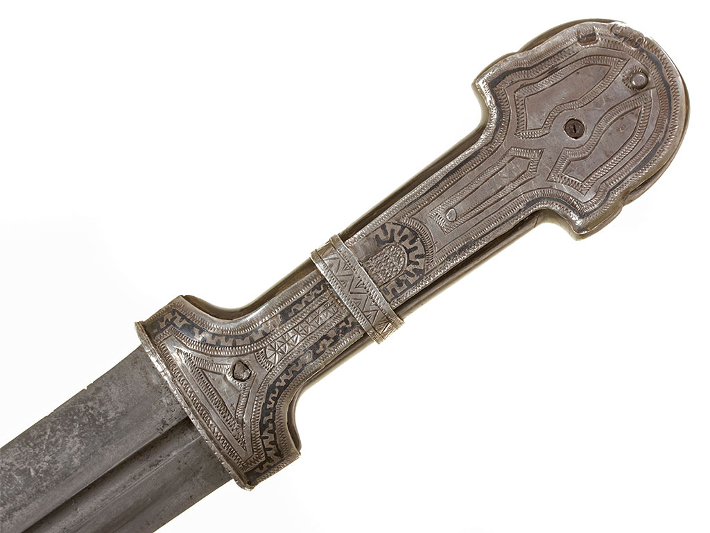 Традиционный кавказский кинжал, изготовленный в конце ХIХ века. Клинок ромбического сечения, с одним узким долом на каждой стороне. С лицевой стороны у основания клинка - клеймо "Османъ". Рукоять из черного рога, с обеих сторон покрыта серебряными накладками, украшенными гравированным геометрическим и растительным орнаментом. Ножны деревянные, обтянутые темно-коричневой кожей. Устье и наконечник ножен серебряные, украшены гравированным орнаментом, покрытым чернью. Все серебряные элементы оправы имеют одинаковые пробирные клейма "84" с эмблемой Тифлисской пробирной палатки (клеймо данной конфигурации использовалось с 1887 по 1899 год) и клеймо неизвестного мастера, выраженное буквами грузинского алфавита.