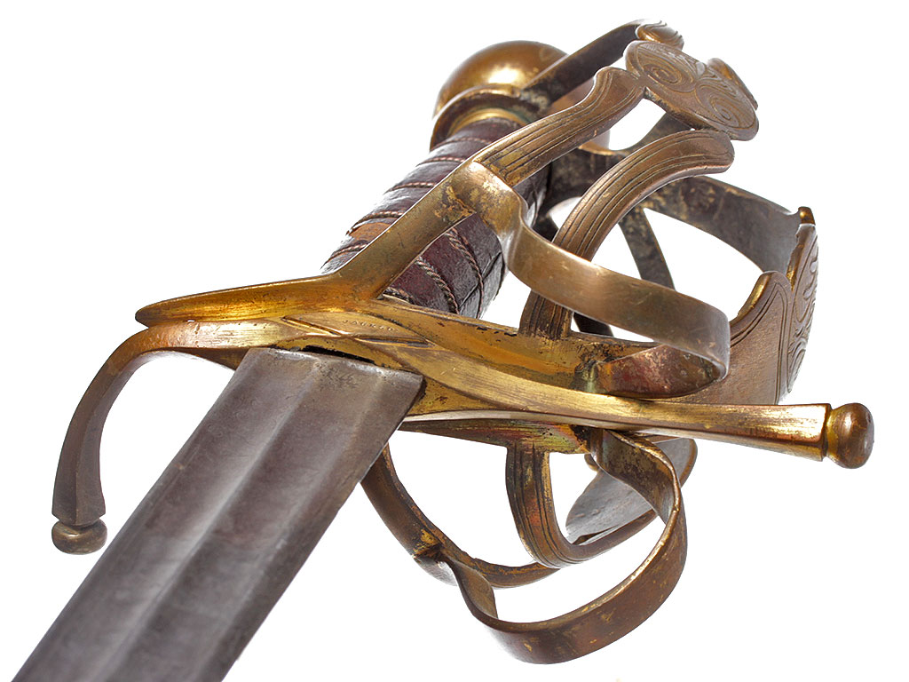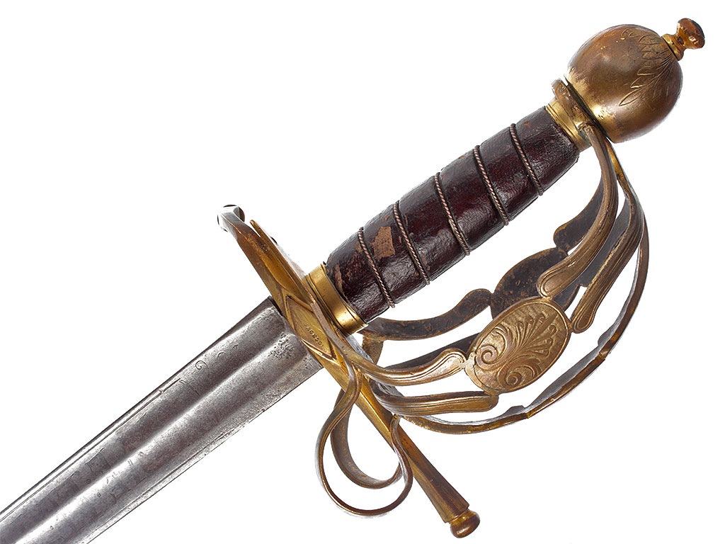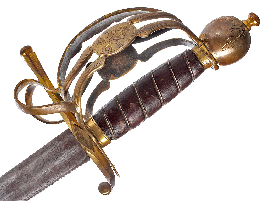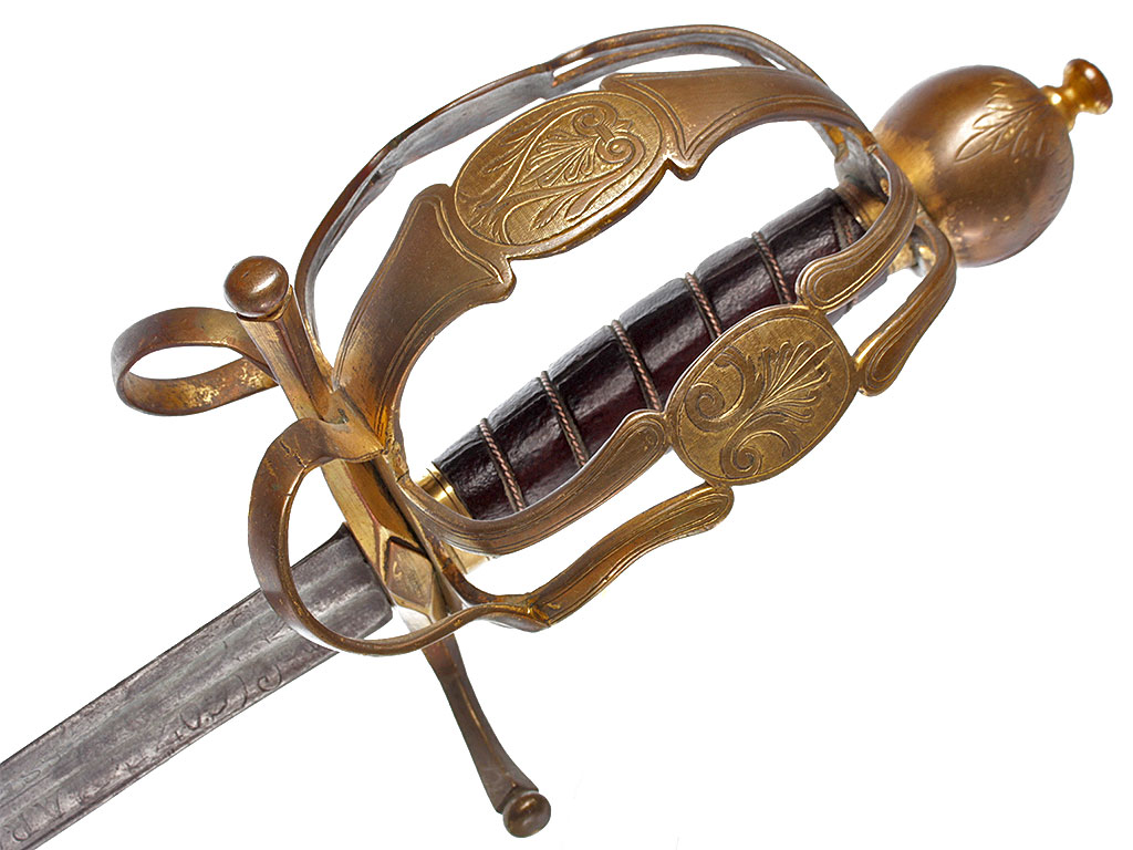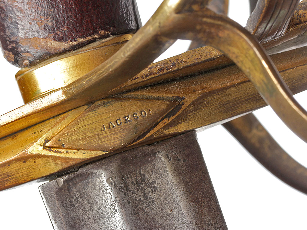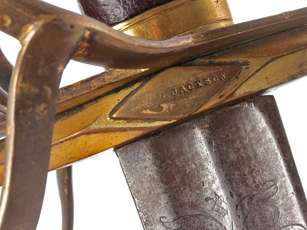 Эфес состоит из рукояти и гарды; металлические части выполнены из позолоченной латуни. Насаженная на хвостовик клинка прямая деревянная рукоять обтянута темно-коричневой кожей и опоясана по диагональным желобкам шестью витками крученой латунной проволоки. Рукоять увенчивает массивная сферическая головка-набалдашник, в верхней части украшенная гравированным орнаментом. Шаровидная гайка на тонкой ножке закрепляет рукоять на хвостовике клинка. В нижней части рукоять охватывает овальная втулка с двумя выточенными поясками. Гарда образована тремя широкими ажурными дужками, формирующими защитную чашку "корзинного" типа. Они соединены с прямой граненой крестовиной, передняя и задняя часть которой оканчивается завитками. Широкие поверхности центральной, а также двух больших боковых дужек украшены гравированным геометрическим орнаментом. Перекрестие прямое, со стороны обуха загнуто в сторону. На перекрестии с обеих сторон в центральной части помещен выступающий ромбический медальон с клеймом мастера "JACKSON" (вероятнее всего, Соломон Джексон - мастер из Бирмингема, работавший в период 1800 - 1815 годов).