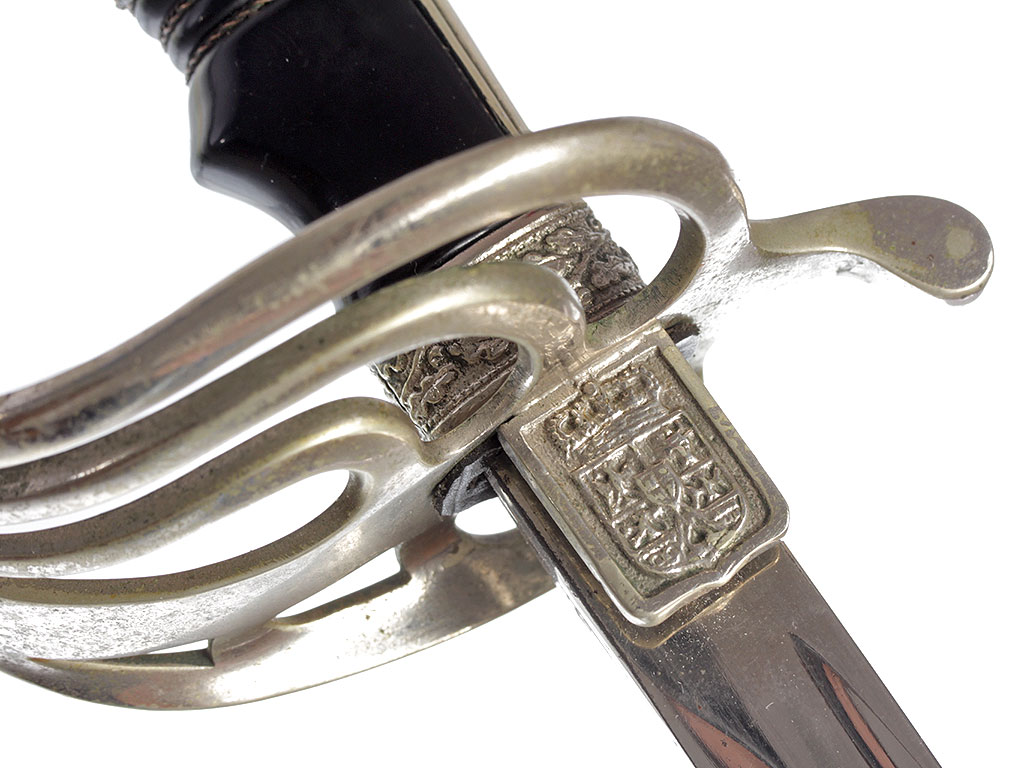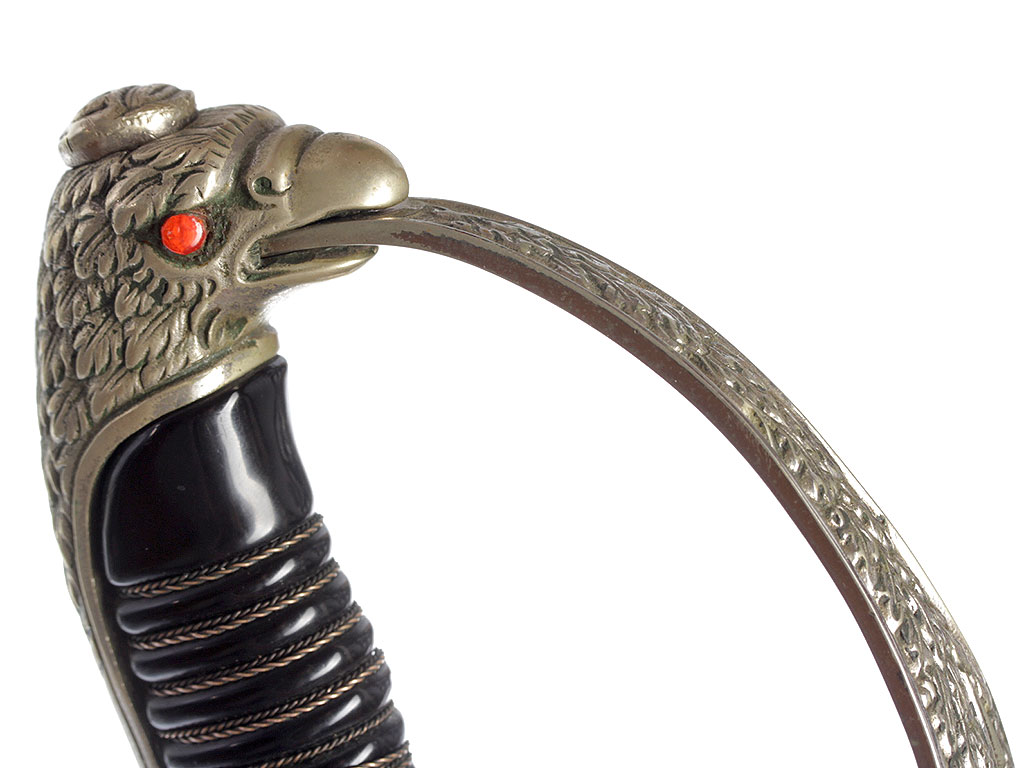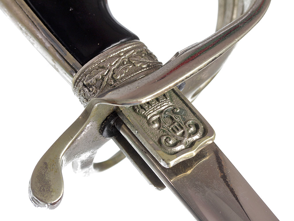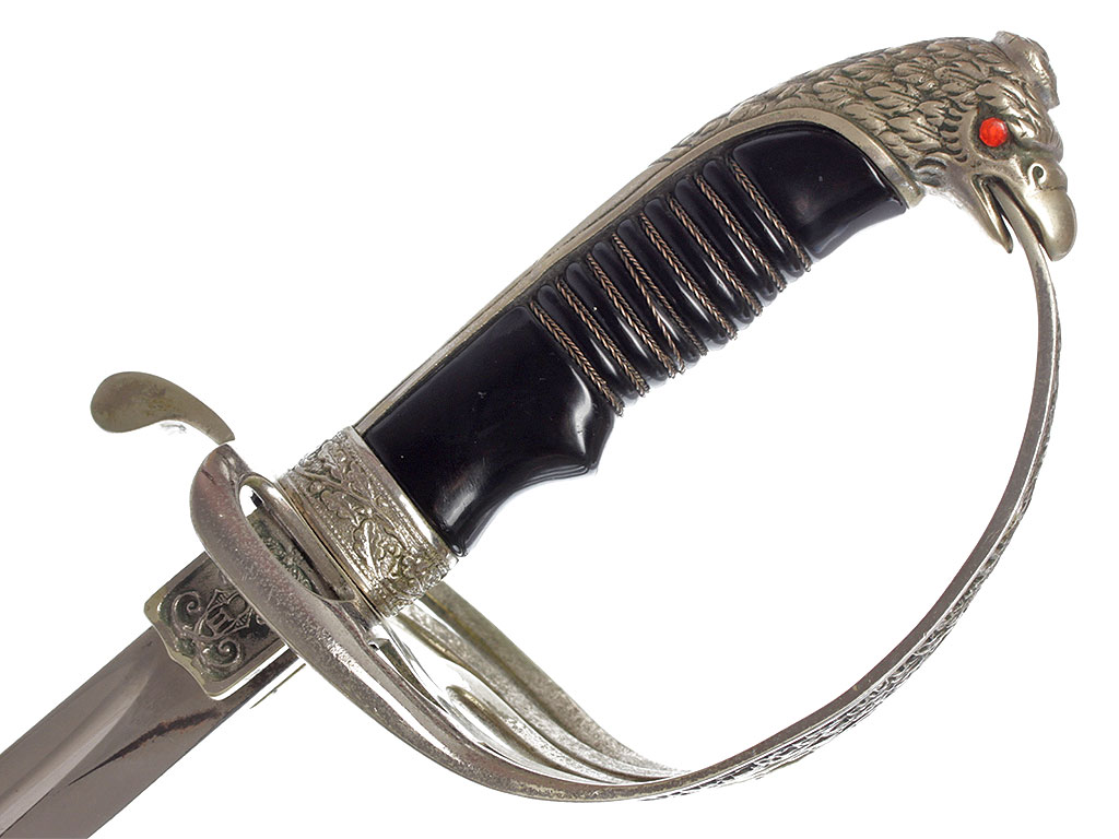 Рукоять из черной пластмассы, со слабо выраженным упором для пальца, обвита по поперечным желобкам витой латунной проволокой. Прибор эфеса изготовлен из никелированной латуни. Спинка рукояти прикрыта планкой, плавно переходящей в навершие. Навершие в виде головы орла с раскрытым клювом, с красными стеклянными вставками в глазах. Гарда состоит из защитной дужки (одной основной и четырех дополнительных), переходящей в перекрестие с каплевидным завершением. На щитке перекрестия с внешней стороны - рельефное изображение государственного герба Королевства Румыния, с внутренней - вензель короля Кароля II (правил королевством с 1930 по 1940 год).