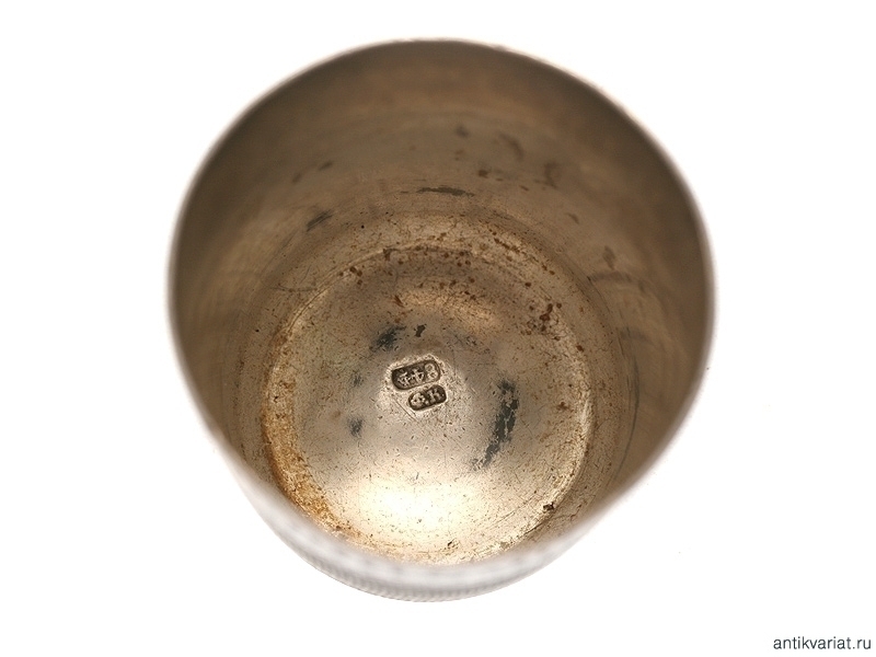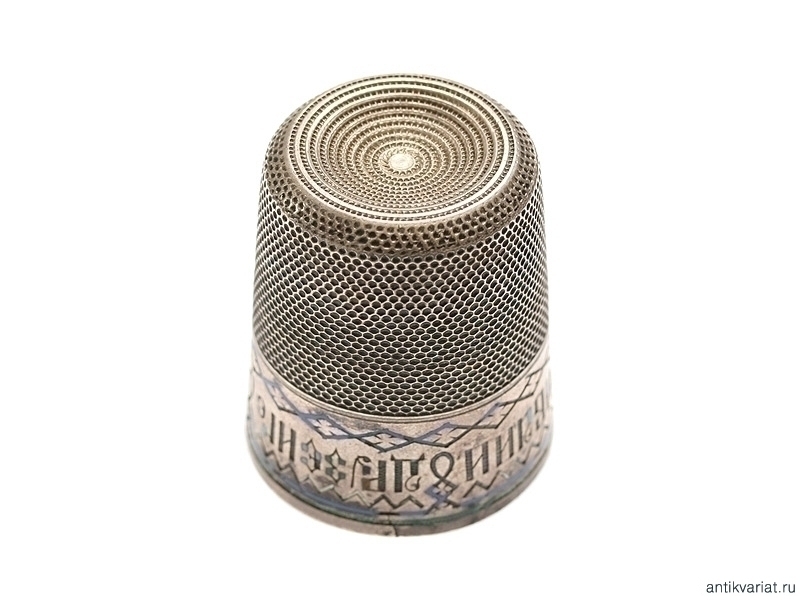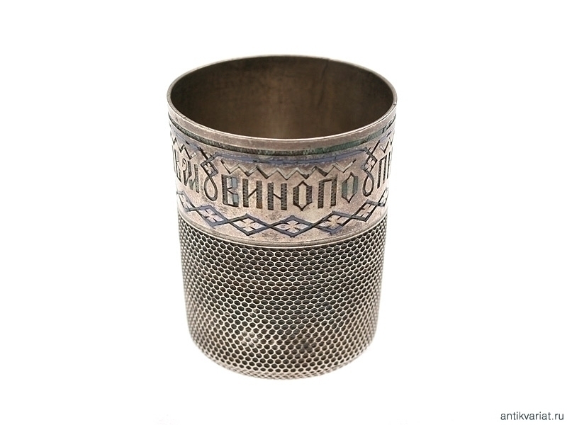 Чарка, изготовленная из серебра 84 пробы с клеймом "Ф.К.". Сделана в виде наперстка, по верхней кромке идет надпись "Вино попивай и друзей не забывай", залитая разноцветной эмалью. Высота 4,6 см. Хорошее состояние, имеются утраты эмали.
