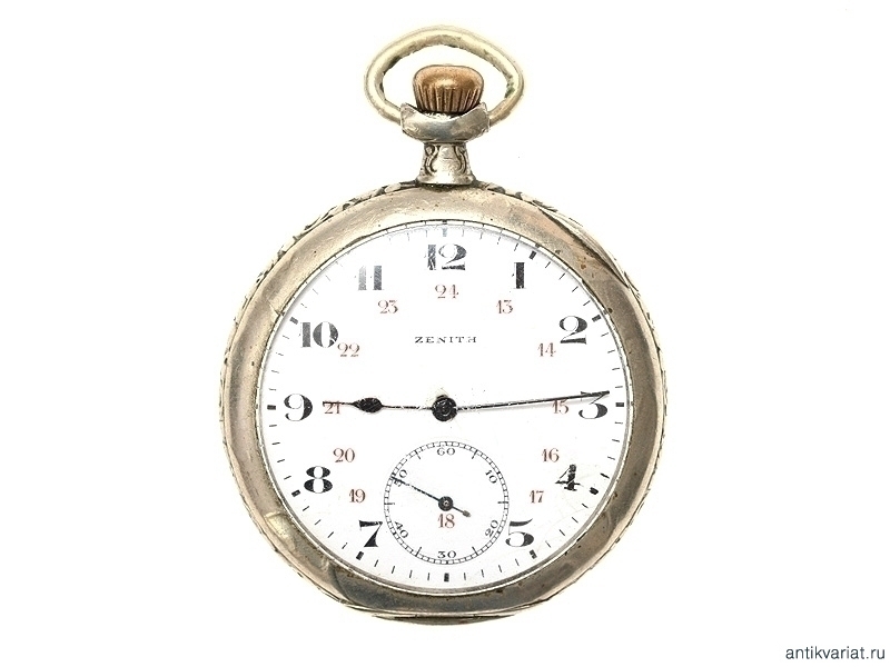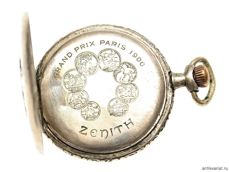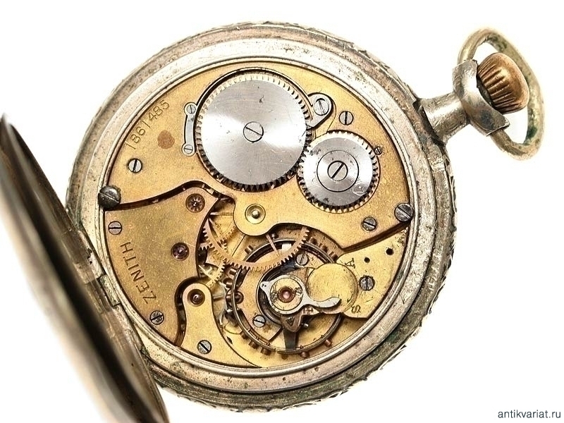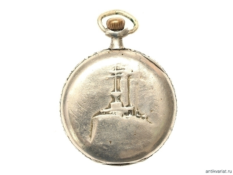 Карманные двухкрышечные часы в серебряном корпусе, изготовленные швейцарской фирмой "Zenith", с рельефным изображением крейсера на крышке. Механизм на ходу, корпус значительно потерт.