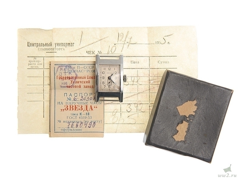 Наручные часы "Звезда" купленные в семье запасливого генерала советской армии, имеется оригинальный чек из Центрального универмага Главвоенторга 1955 года, паспорт к часам с гарантией годности. Часы на ходу и в прекрасном состоянии.