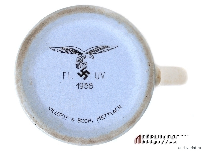 Чайная чашка с символикой Люфтваффе, выпущенная известной фирмой "Villeroy & Boch" в 1938 году. Тулово кружки выполнено из голубоватого фарфора, ручка белая. Предмет в отличной сохранности.