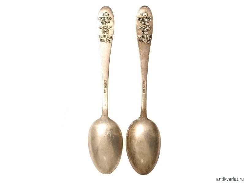 Парные серебряные чайный ложки с рельефным изображением щита с гербом Швейцарии и еловой лапки. На оборотной стороне черенка - надпись готическим шрифтом "Солдатское Рождество 1944". Серебро 800 пробы. Очень хорошее состояние, красивая патина.