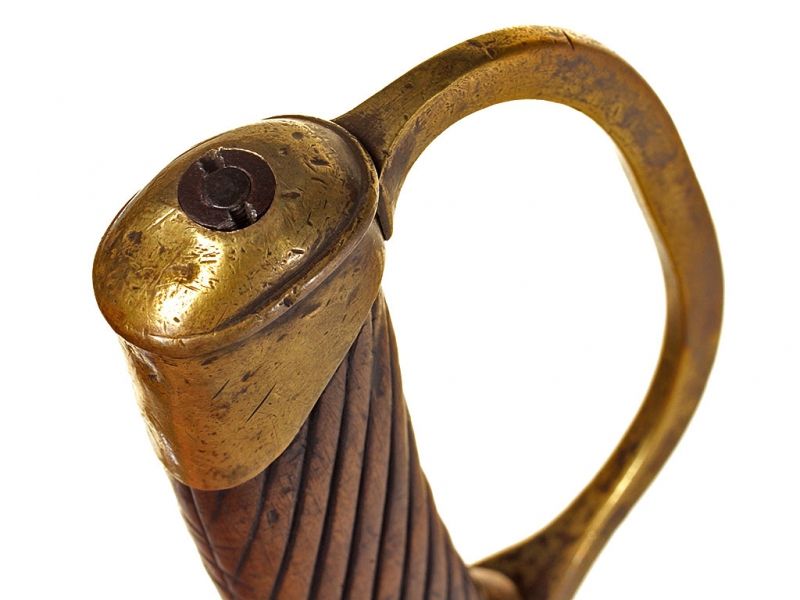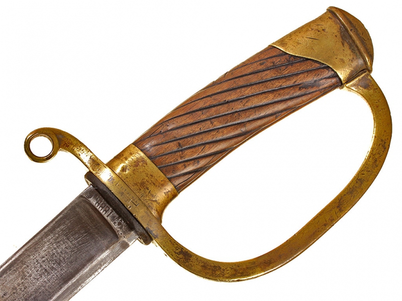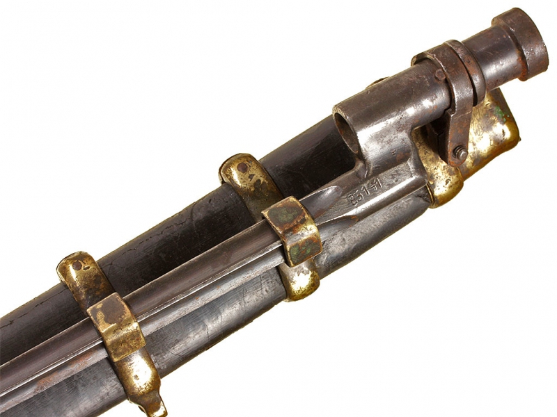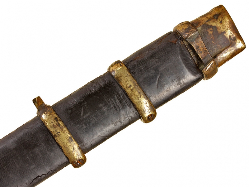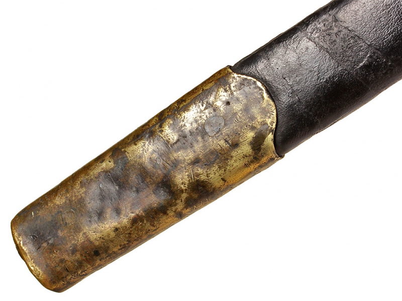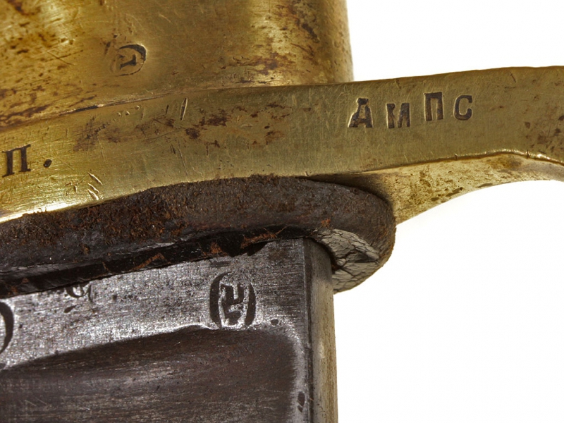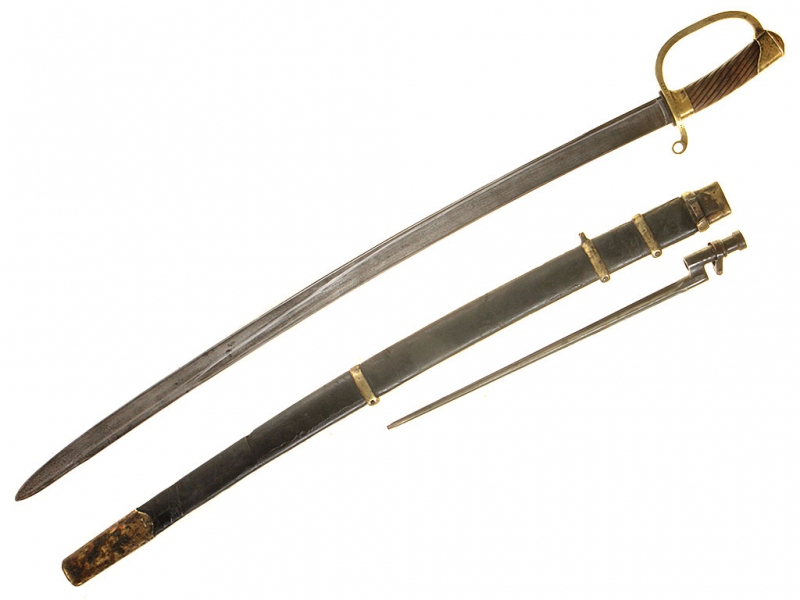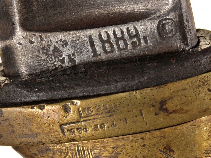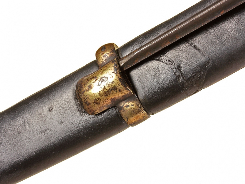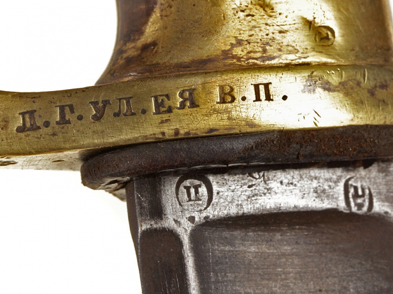 Пример уставного длинноклинкового оружия с редким клеймом полковой принадлежности - шашка нижних чинов драгунского типа образца 1881 года. Клинок с клеймом Златоустовской оружейной фабрики у основания, выпуска 1889 года, имеются клейма военной приемки. Рукоять деревянная, с наклонными продольными желобками. Прибор гарды бронзовый, с клеймами военной приемки и клеймами полковой принадлежности "Л. Г. УЛ. ЕЯ В. П." (Лейб-гвардии Ея Императорского Величества полк). Ножны деревянные, обтянутые черной кожей, с бронзовым прибором с колодой под штык. Сам штык в комплекте.