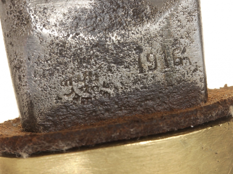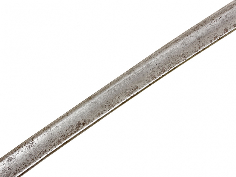 Казачья шашка нижних чинов образца 1881 года в хорошем состоянии. Клинок незначительной кривизны, однолезвийный (боевой конец двулезвийный), с одним широким долом с каждой стороны. У основания клинка имеются приемочные клейма и клеймо Златоустовской оружейной фабрики с годом выпуска - 1916. На клинке - незначительные поверхностные следы коррозии.