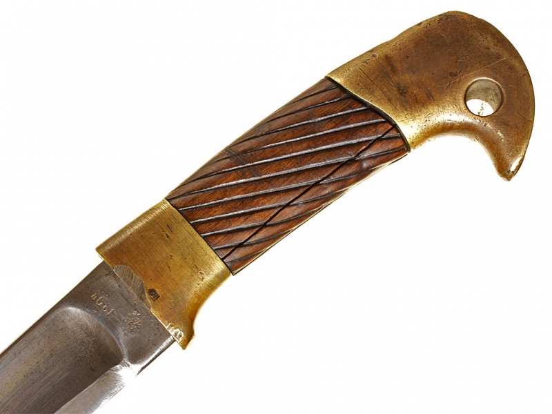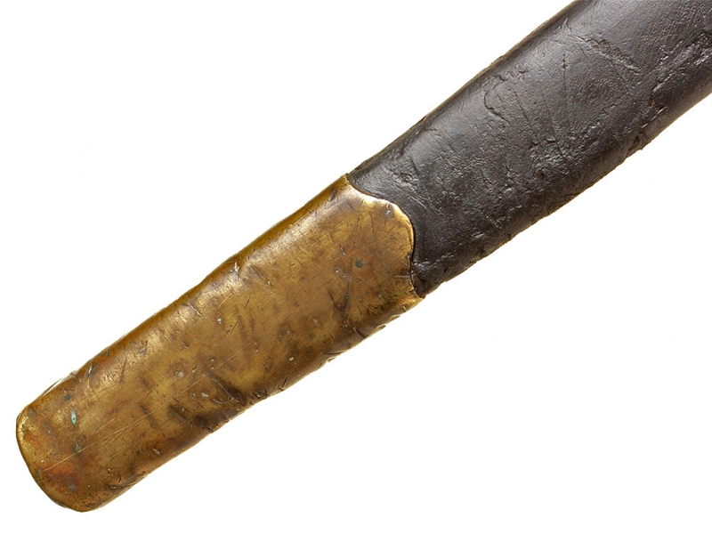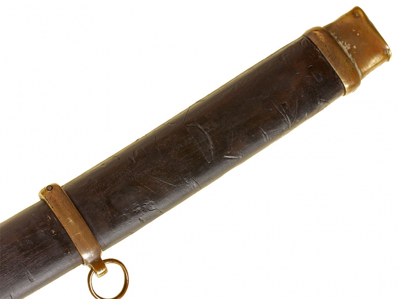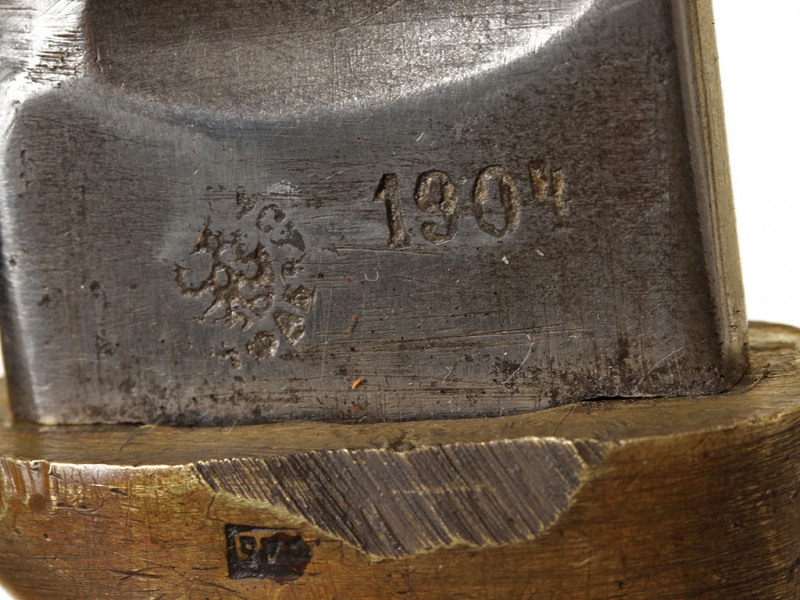 Казачья шашка нижних чинов образца 1881 года в хорошем состоянии. Клинок с широким долом, однолезвийный (боевой конец двулезвийный). Имеются клейма приемки и Златоустовской оружейной фабрики с годом выпуска - 1904. На обоймице основания рукояти - частично читаемое клеймо Златоустовской оружейной фабрики. Рукоять деревянная, с продольными наклонными желобками. Головка рукояти латунная, раздвоенная, с отверстием для темляка. Ножны в оригинальной грунтовке, с латунным прибором.