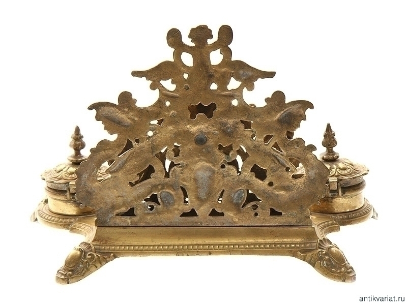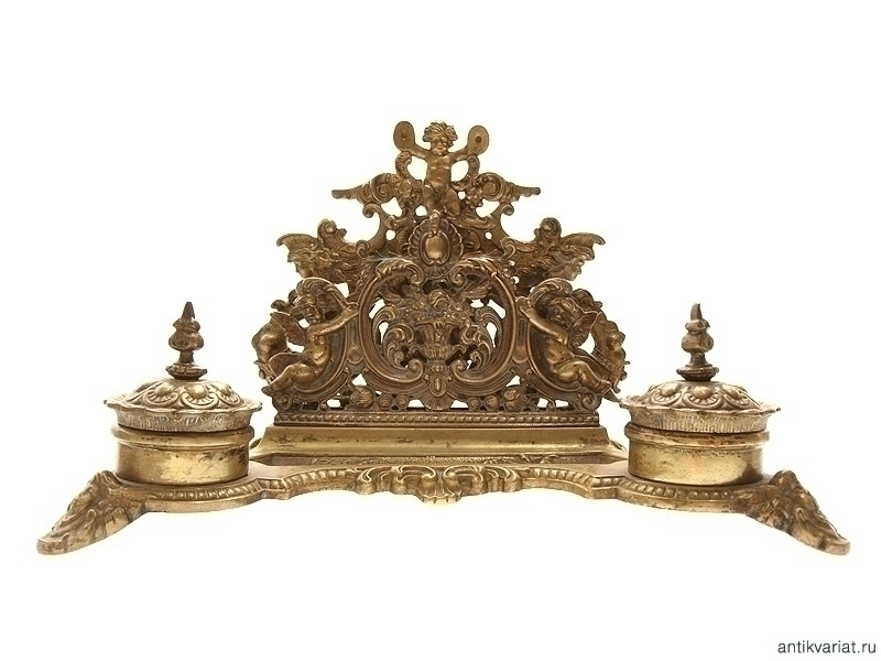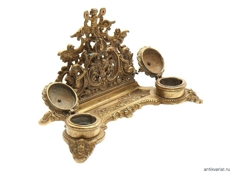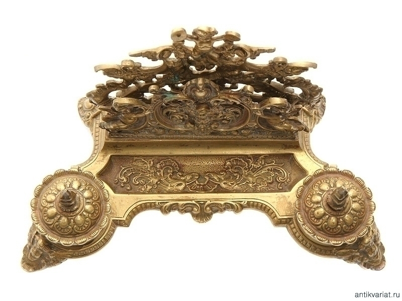 Настольный чернильный прибор, богато декорированный в стиле второго рококо. Скомпонован из держателя для листов бумаги, подставки для перьев и двух чернильниц с откидывающимися крышками. Бронза, конец XIX - начало ХХ века.