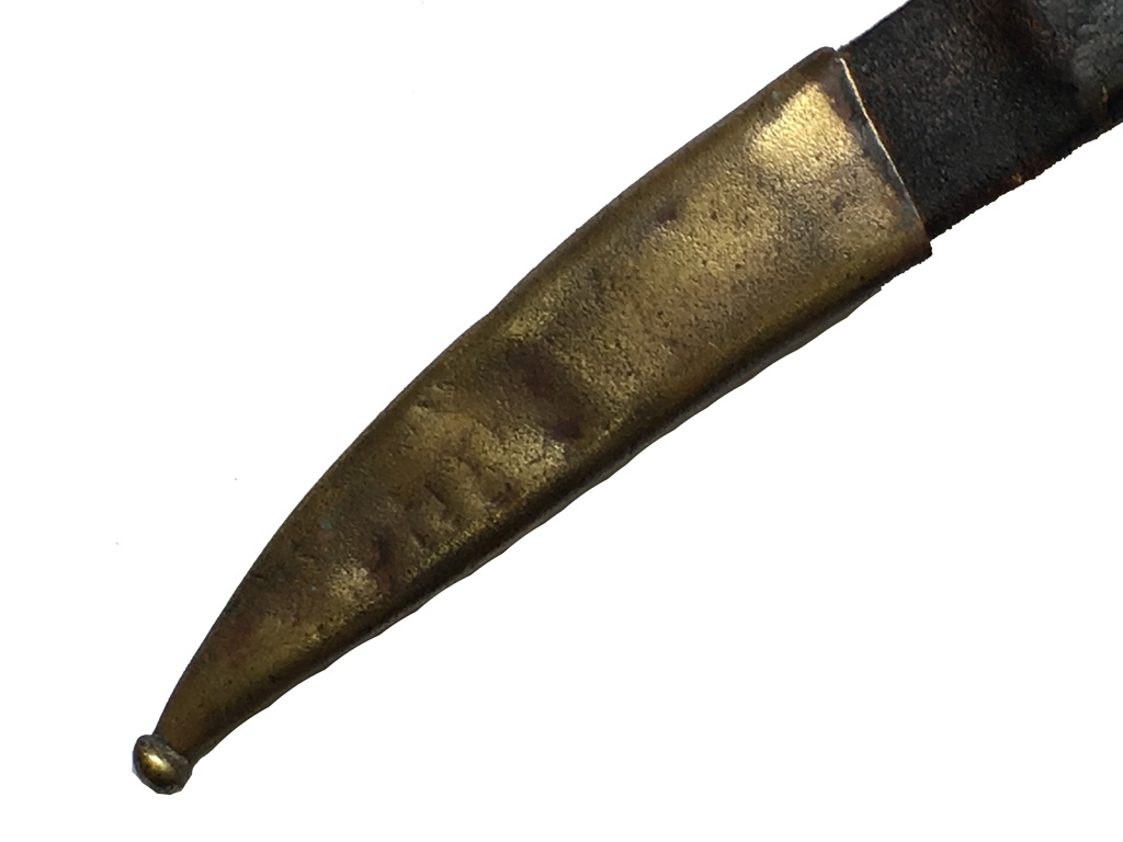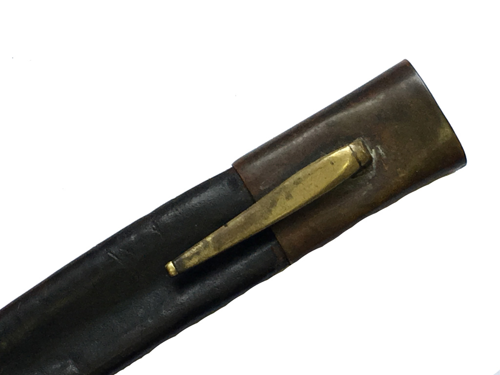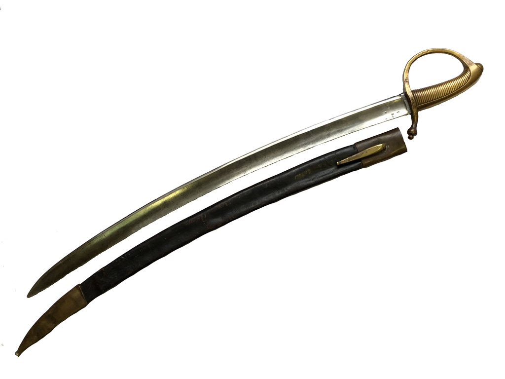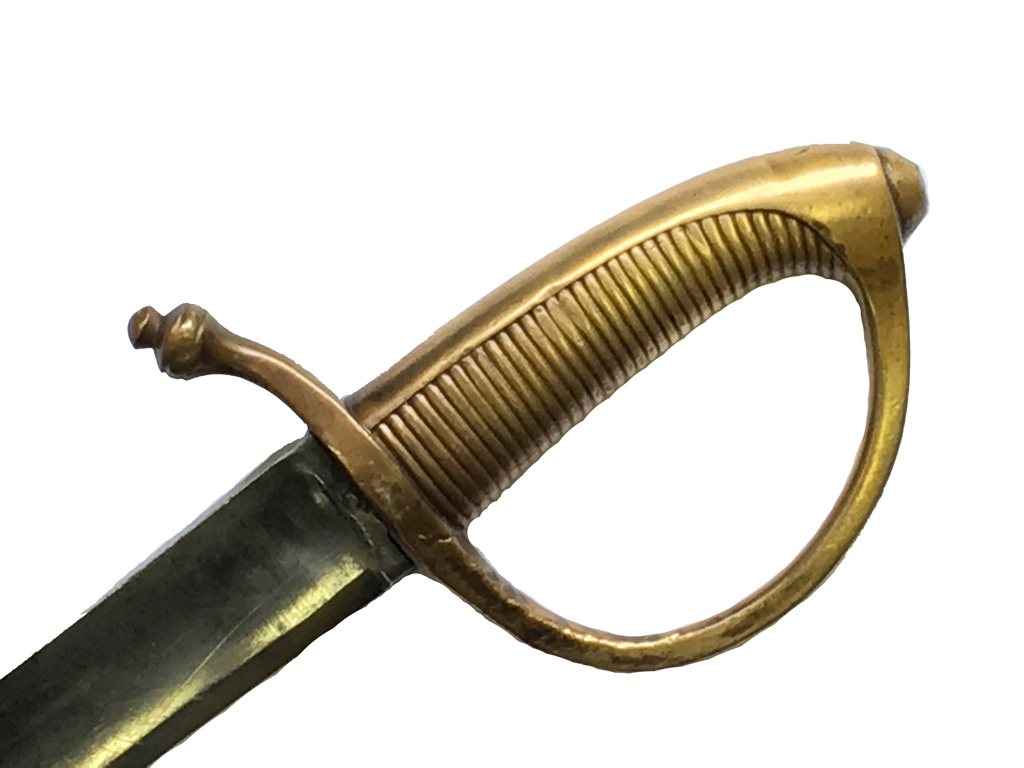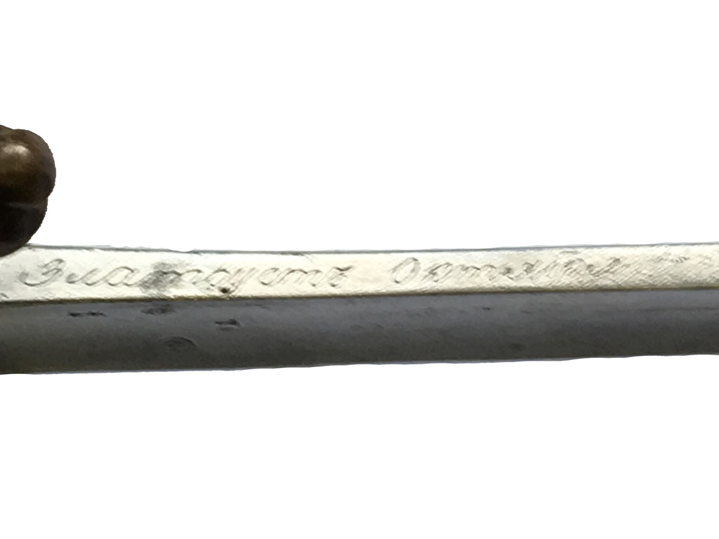 Пехотный тесак нижних чинов образца 1817 года. Клинок незначительной кривизны, с одним широким долом на каждой стороне. На обухе клинка - гравированная иглой надпись: "Златоустъ октября 1834 года". У основания клинка - приемочные клейма. Эфес цельнометаллический, изготовлен из бронзы. Ножны из плотной черной лакированной кожи, с бронзовым устьем и наконечником. На устье с лицевой стороны имеется крючок для крепления к портупее.