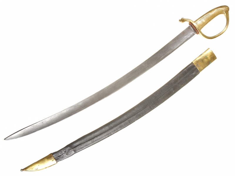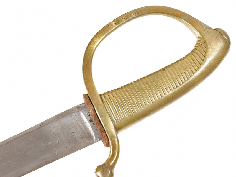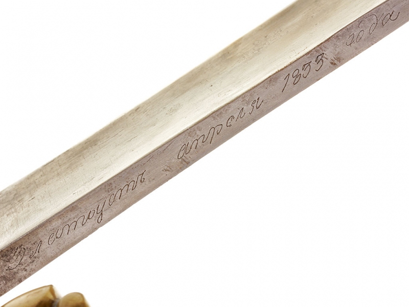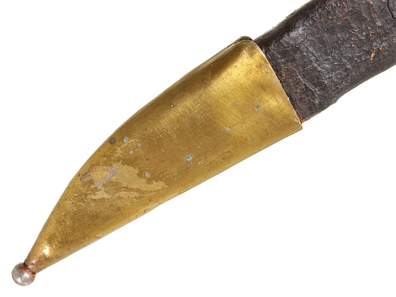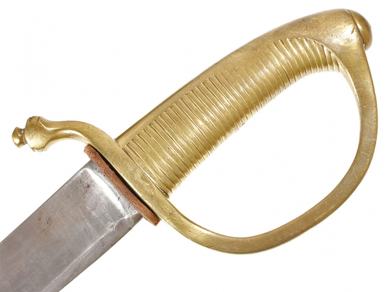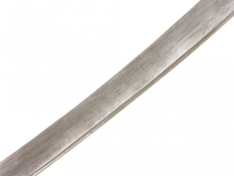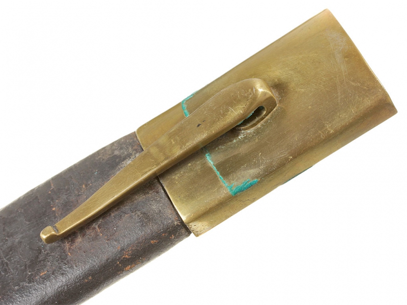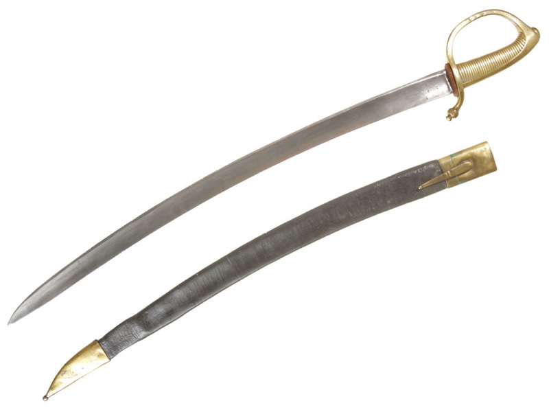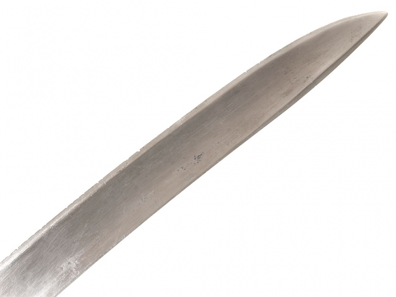 Пехотный тесак нижних чинов образца 1817 года. Клинок незначительной кривизны, с одним широким долом на каждой стороне. На обухе клинка - гравированная иглой надпись: "Златоустъ апреля 1833 года". У основания клинка - приемочные клейма. Эфес цельнометаллический, изготовлен из бронзы. Ножны из плотной черной лакированной кожи, с бронзовым устьем и наконечником. На устье с лицевой стороны имеется крючок для крепления к портупее.