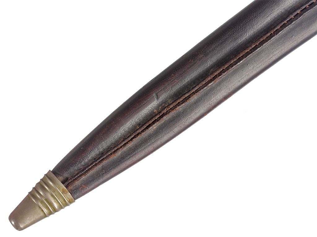 Клинок прямой, вороненый, ромбического сечения, без клейм. Рукоять омедненная, в оригинальном черном красочном покрытии, на гарде - клейма изготовителя "William Rodgers Sheffield England". Ножны кожаные, с металлическим наконечником. Ремешок фиксатора самодельный, установлен очередным владельцем взамен оторванного оригинального.