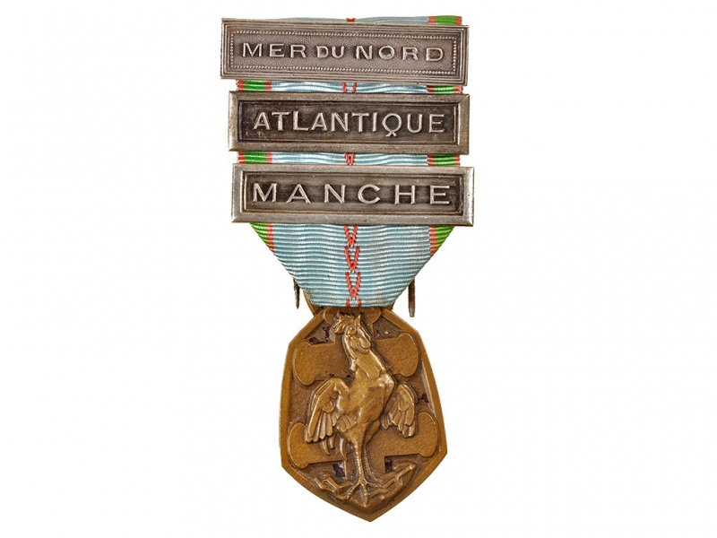 Памятная медаль участника Второй мировой войны. Бронза, на оригинальной колодке с планками "MER DU NORD", "ATLANTIQUE" и "MANCHE".
