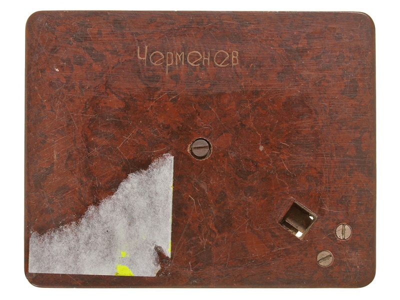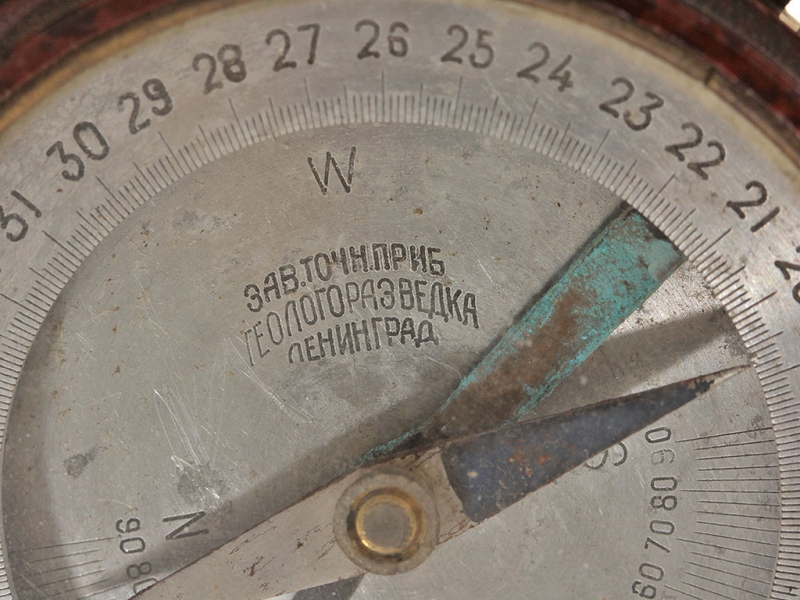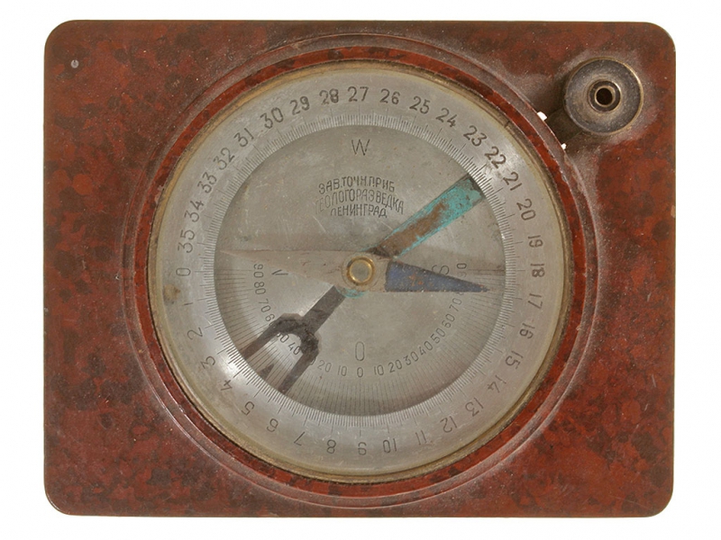 Компас в бакелитовом корпусе, изготовленный в 1930-х годах заводом точных приборов "Геологоразведка" в Ленинграде. Применялся при полевых исследованиях. На оборотной стороне корпуса нацарапана фамилия владельца: "Черменев".