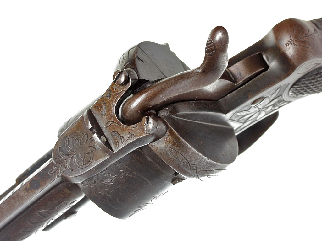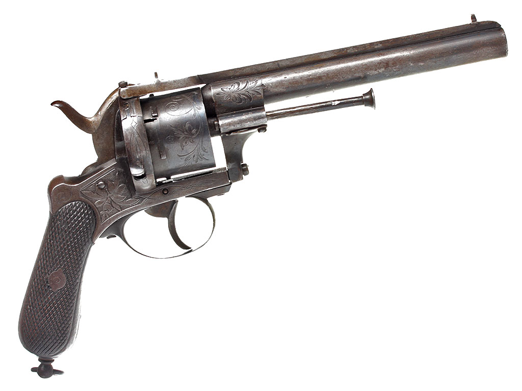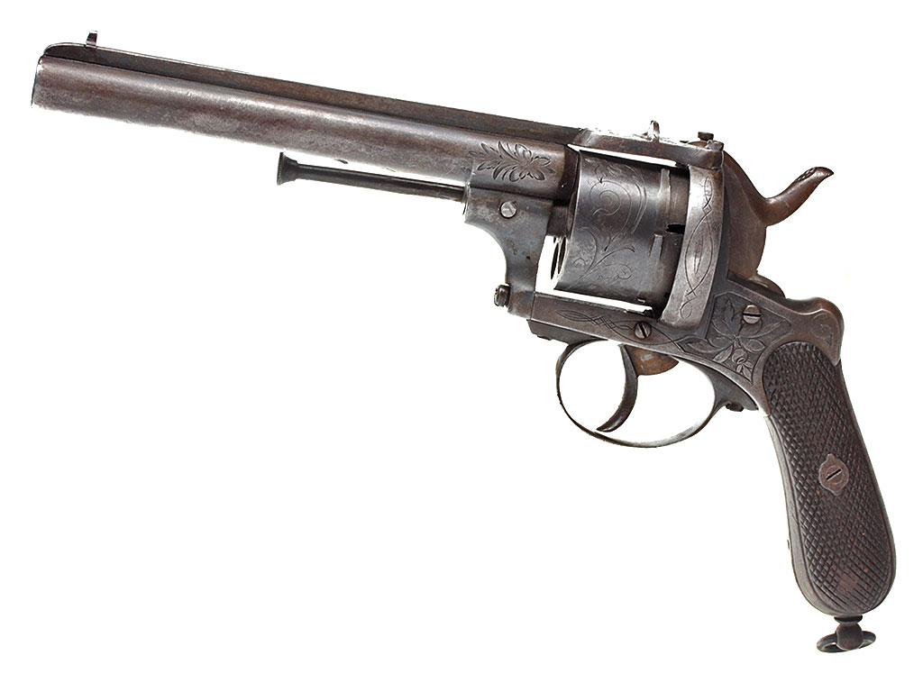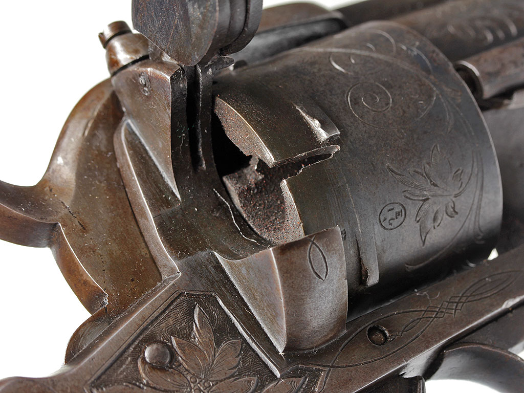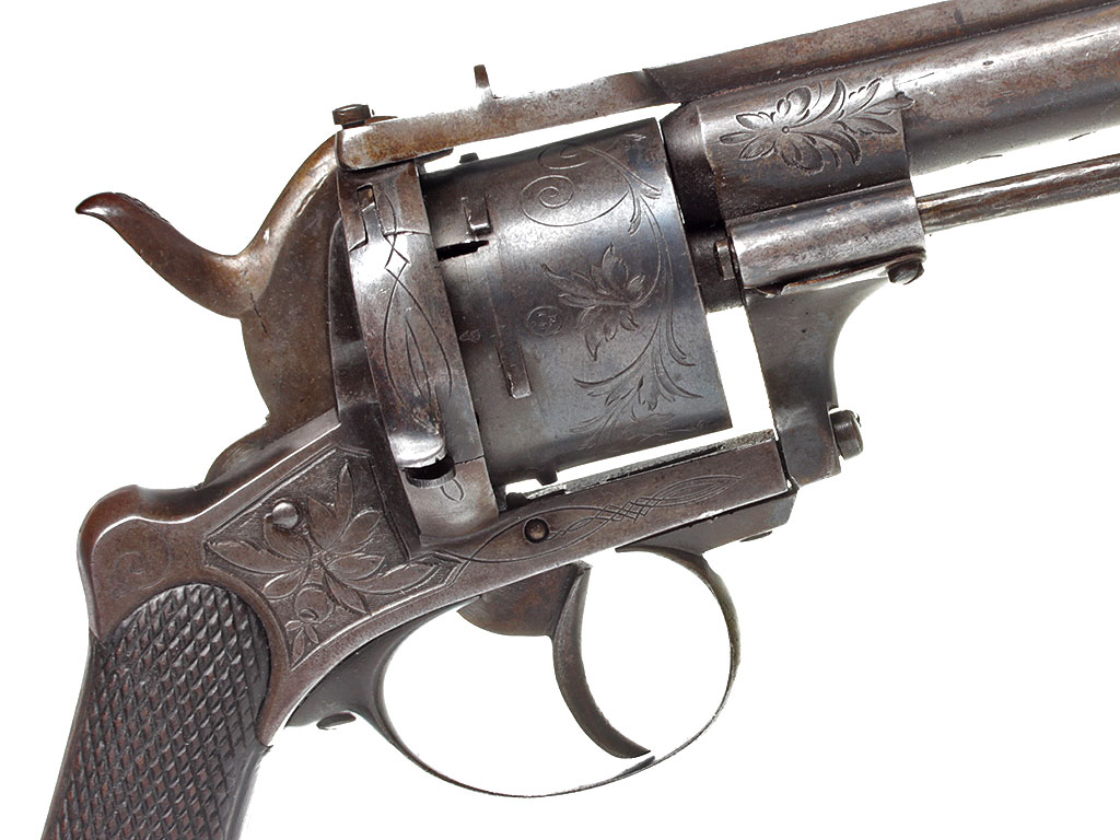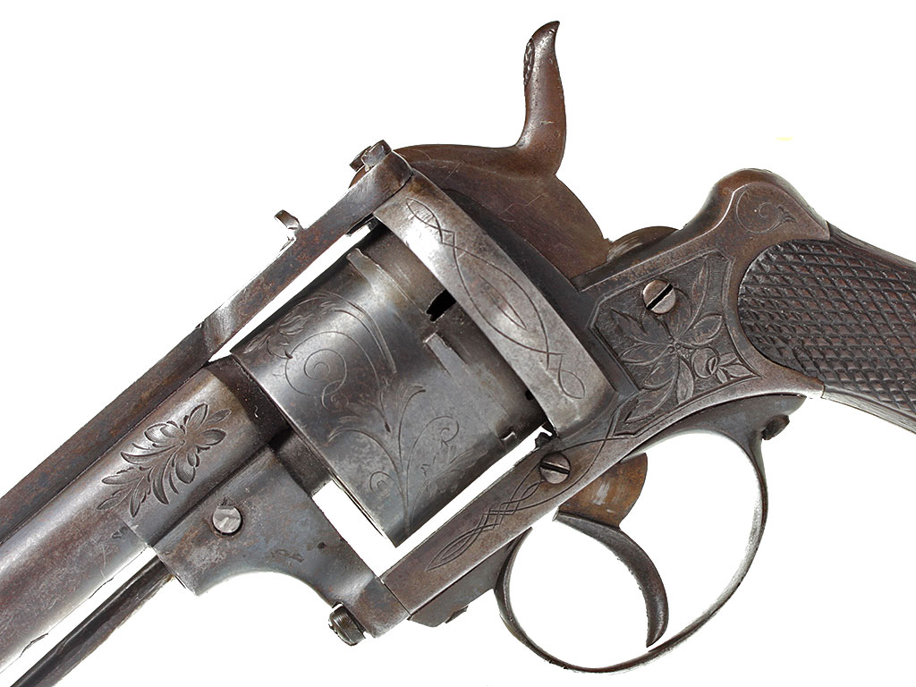 Шестизарядный шпилечный револьвер системы Лефоше, изготовленный в конце 1850-х - 1860-х годах. На барабане имеется льежское приемочное клеймо. Рама и барабан украшены гравированным растительным орнаментом.