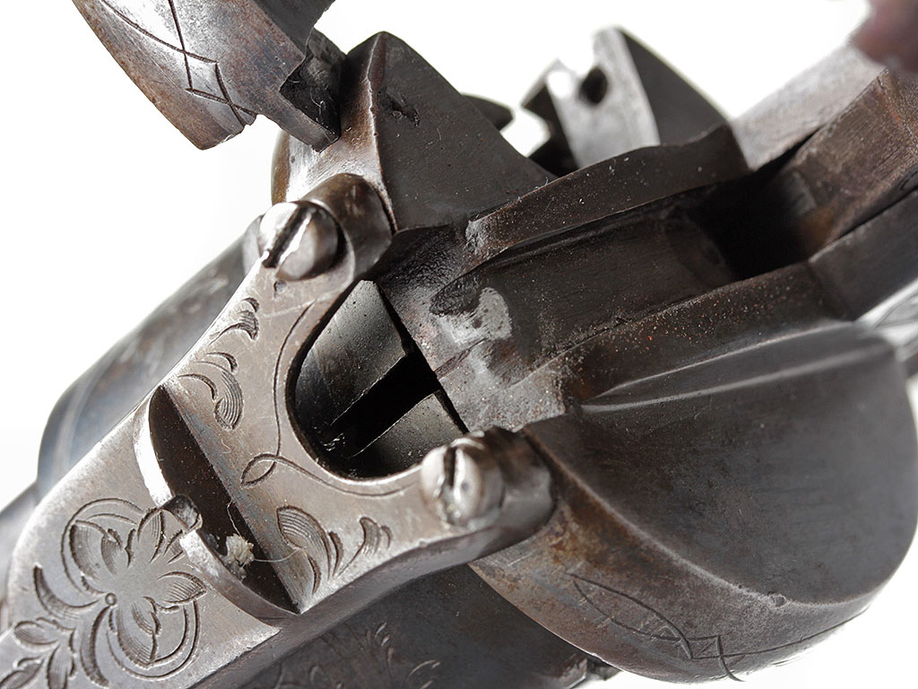 Его изобретение нашло широкое применение в револьверах того времени. Замок в представленном образце допускает возможность ведения как поочередной целевой стрельбы, так и стрельбы самовзводом. Револьвер в очень хорошей сохранности.