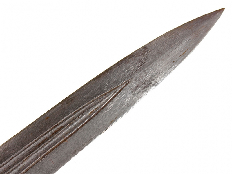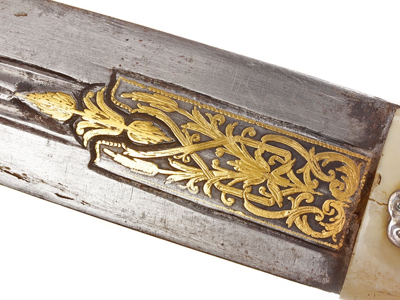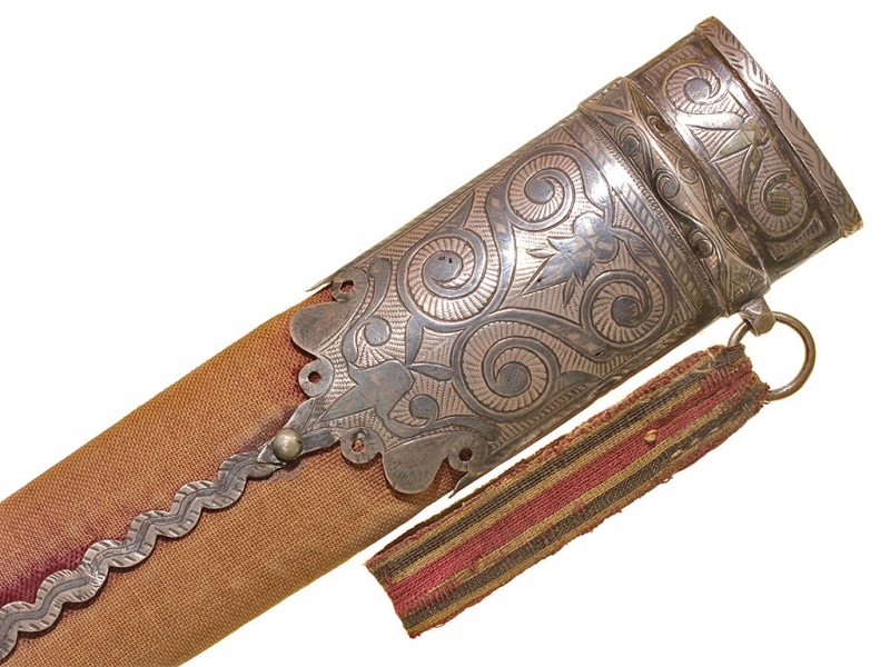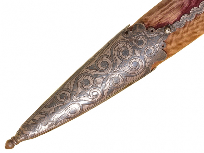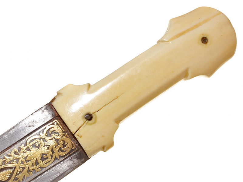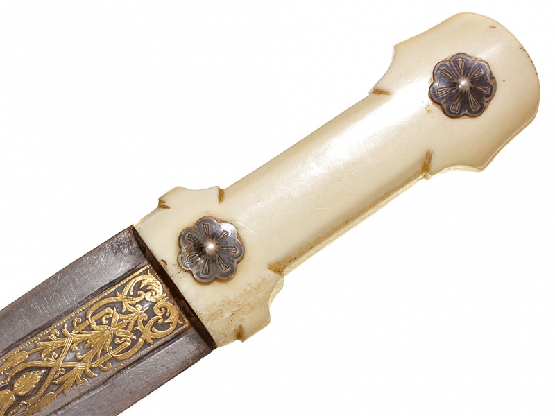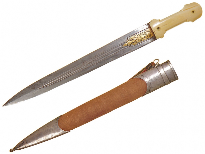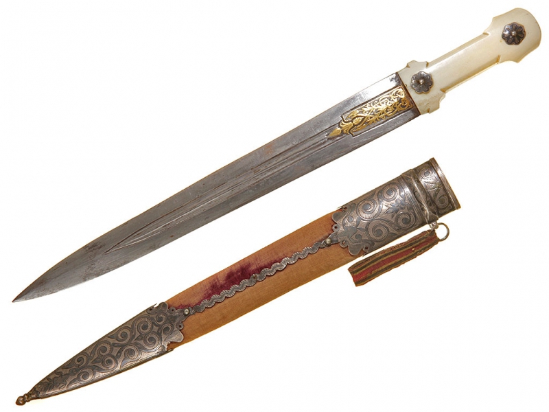 Кинжал с клинком работы закавказских мастеров, изготовленный в третьей четверти XIX века. Клинок сложнопрофилированный, с двумя узкими и тремя еще более узкими долами, у основания с обеих сторон украшен картушами с таушированным золотом растительным орнаментом. Рукоять из слоновой кости, скрепленная с хвостовиком клинка медными заклепками, шляпки которых изготовлены из серебра и украшены черневым орнаментом. Ножны деревянные, обтянутые бархатом вишневого цвета (вытертым от ношения), имеют серебряные устье и наконечник, соединенные между собой с лицевой стороны декоративной "змейкой". Украшены черневым растительным орнаментом, стиль работы по серебру близок работам тифлисских мастеров. Наконечник имеет следы старого ремонта. Сохранился галунный подвес.