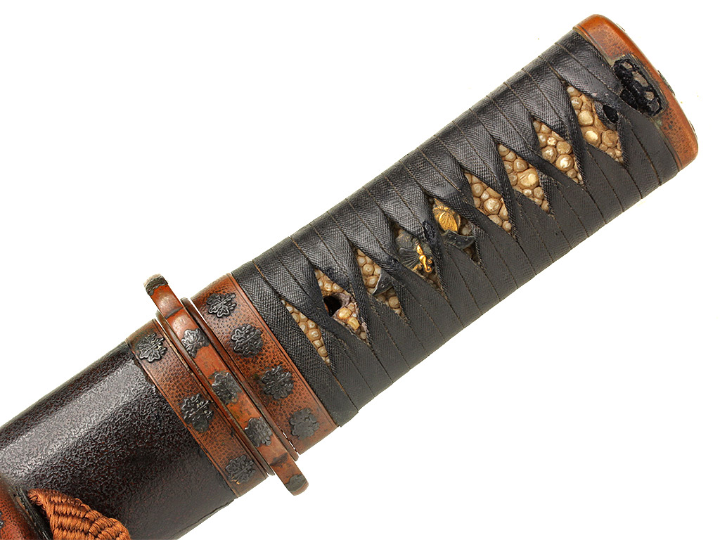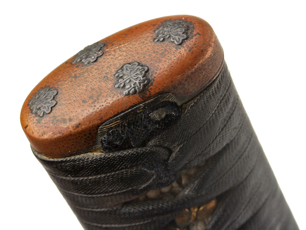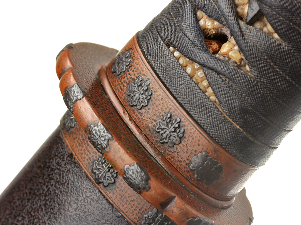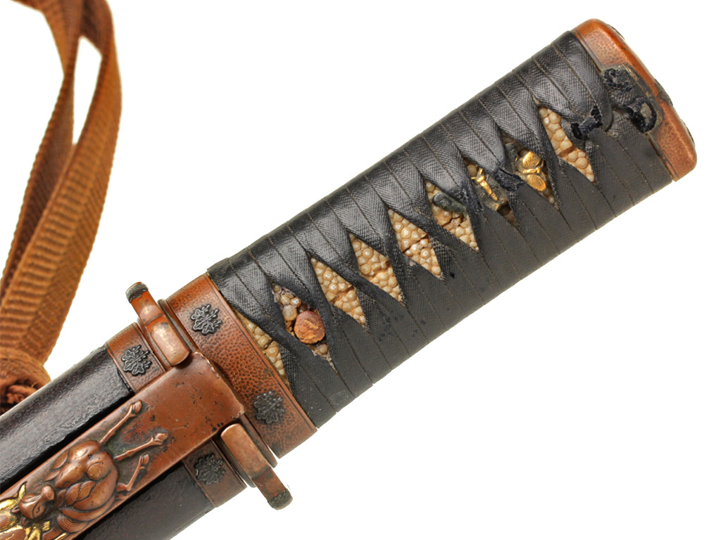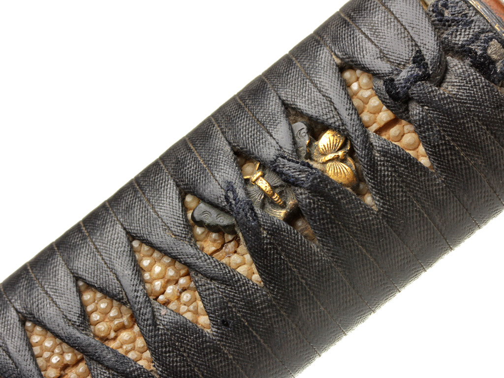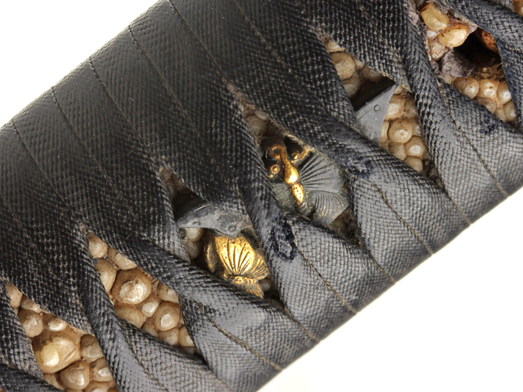 Рукоять (цука) образована двумя склеенными между собой деревянными частями с одним сквозным отверстием для колышка мэкуги. Покрыта шкурой ската (самэ). Поверх самэ в традиционном стиле наложена обмотка узким плотным фактурным шнуром цука-ито черного цвета. Под оплеткой рукояти с обеих сторон помещены изготовленные из цветного металла рельефные художественные накладки мэнуки. Обе накладки выполнены в виде изображений пары порхающих бабочек, символизирующих собой союз влюбленных сердец. В Японии изображению бабочки придавали большое значение. В период войн Гэмпэй герб (мон) могущественного клана Тайра украшало изображение бабочки. В бабочке виделся символ перерождения и бессмертия, существовали поверья, что в образе бабочки в мир живых приходят души умерших. Рукоять увенчана чашеобразным навершием касира, а в ее основании находится муфта фути. Фути и касира изготовлены из сплава сякудо, представляют собой пару и украшены стилизованными изображениями павлонии го-сан-но-кири.