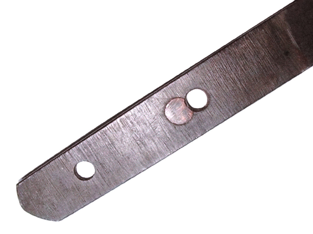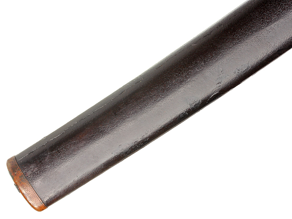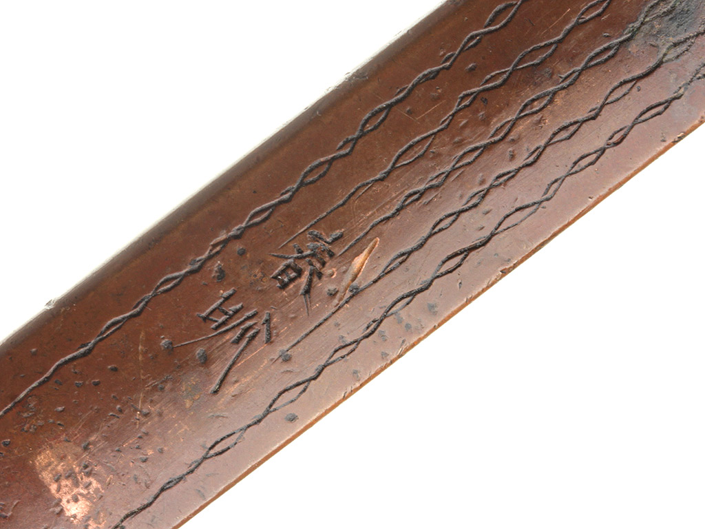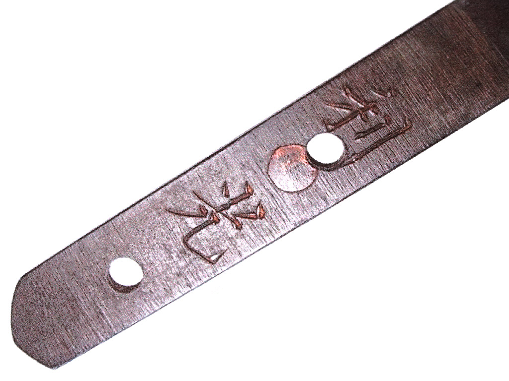 Конструкция клинка - хира-дзукури с незначительным изгибом типа утидзори. Обух клинка низкий, конической формы. На всей протяженности клинка прослеживается область закаленного края якиба и его узор хамон, представленный прямой широкой линией. В основании клинок имеет выполненную из цветного металла плоскую муфту хабаки с покрытием фиолетово-черного цвета, что характерно для сплава сякудо. Хвостовик клинка естественной (первоначальной) формы, имеет три отверстия мэкуги-ана, которые предназначены для крепления клинка в рукояти с помощью деревянного колышка. Верхнее отверстие является функциональным в данной оправе и совмещено с запломбированным цветным металлом более ранним отверстием большего диаметра. Наличие запломбированного отверстия свидетельствует о замене оправы, что часто встречается у старых клинков. Хвостовик имеет авторскую подпись кузнеца-изготовителя, состоящую из двух иероглифических символов, нанесенных методом чеканки: "Тосимицу".