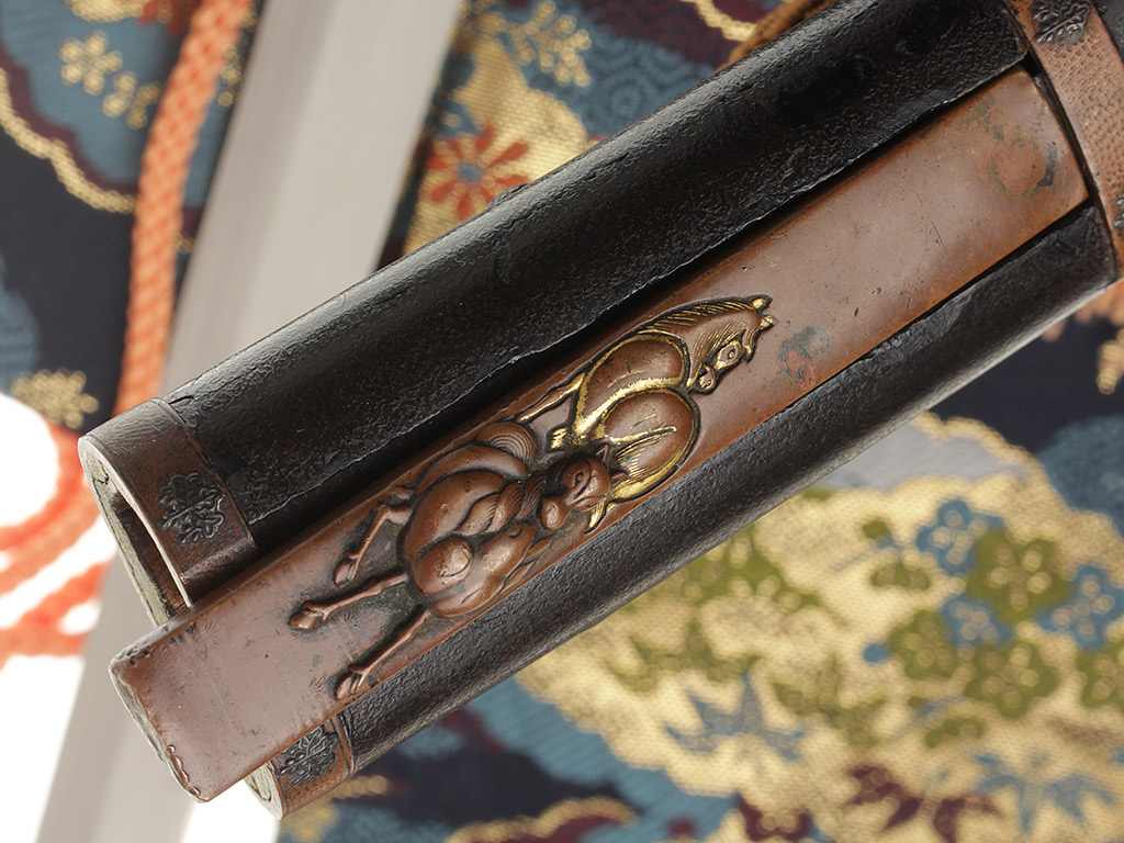 Ножны сая образованы двумя деревянными полосами, склеенными между собой. Покрыты многослойным черным лаком с последующей обработкой, дающей покрытию ножен характерную фактуру. С внешней стороны ножен расположен выступ куригата с прорезью для шнура сагэо. С вннутренней стороны имеется полость для миниатюрного ножа когатана, металлическая рукоять кодзука которого изготовлена из сплава сякудо. На клинке когатана нанесены иероглифические символы. На лицевой стороне рукояти помещено частично позолоченное рельефное изображение двух лошадей. Оборотная сторона украшена тонким гравированным орнаментом и содержит подпись мастера "Хару(аки)".