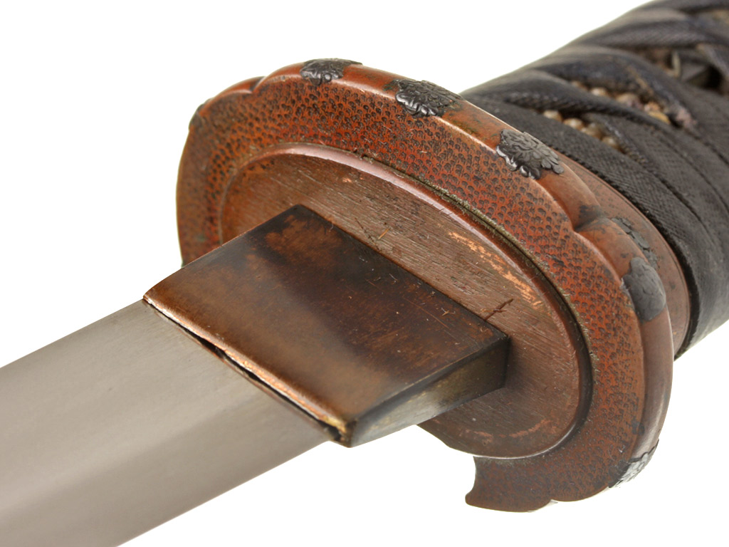 Узкая овальная гарда (хамидаси-цуба) выполнена из цветного металла и имеет боковой вырез для вспомогательных предметов, предусмотренных конструкцией ножен (кодзука). По краю цуба имеет аналогичную другим элементам оправы художественную композицию из стилизованных изображений павлонии. Изображение павлонии в японской орнаменталистике восходит к эпохе Хэйян и наряду с изображением хризантемы является геральдическим символом императорского дома.