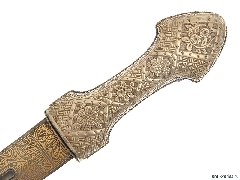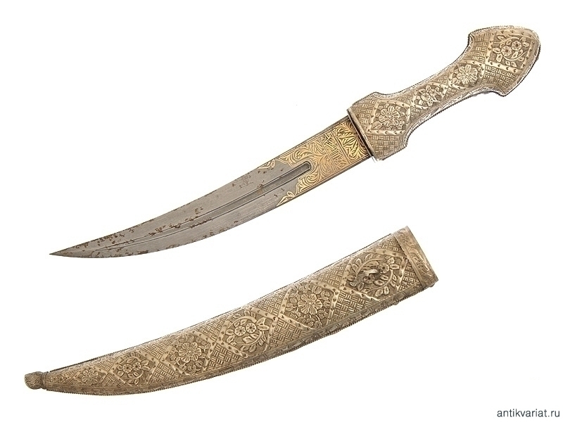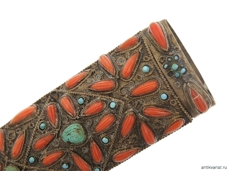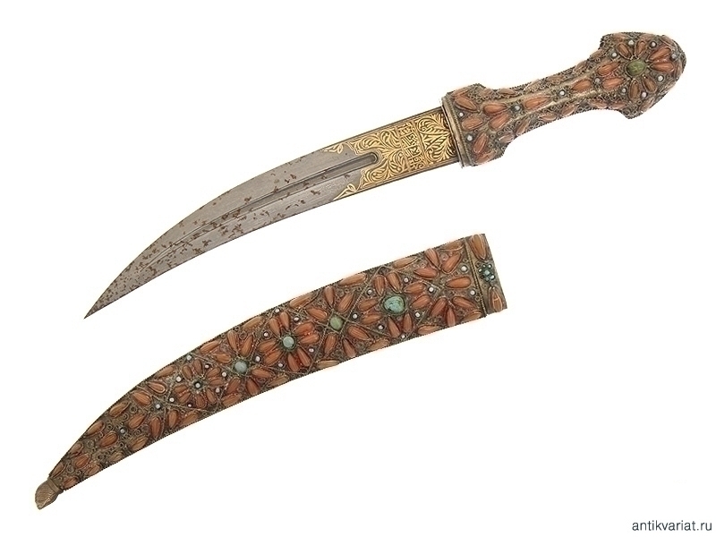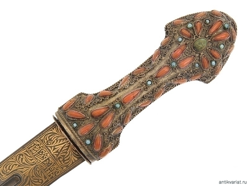 Кинжал украшенный настоящими кораллами и бирюзой конца XIX века, клинок кованой дамасской стали мелкого-красивого узора, у основания имеет сложную золотую таушировку в виде растительного орнамента и текста на арабском языке. Рукоять серебряная, дутая отделана чеканкой с оборотной стороны и вставками с кораллами и бирюзой с лицевой. Ножны сделаны также полностью из серебра с чеканкой и отделкой кораллами и бирюзой. Хорошее состояние.